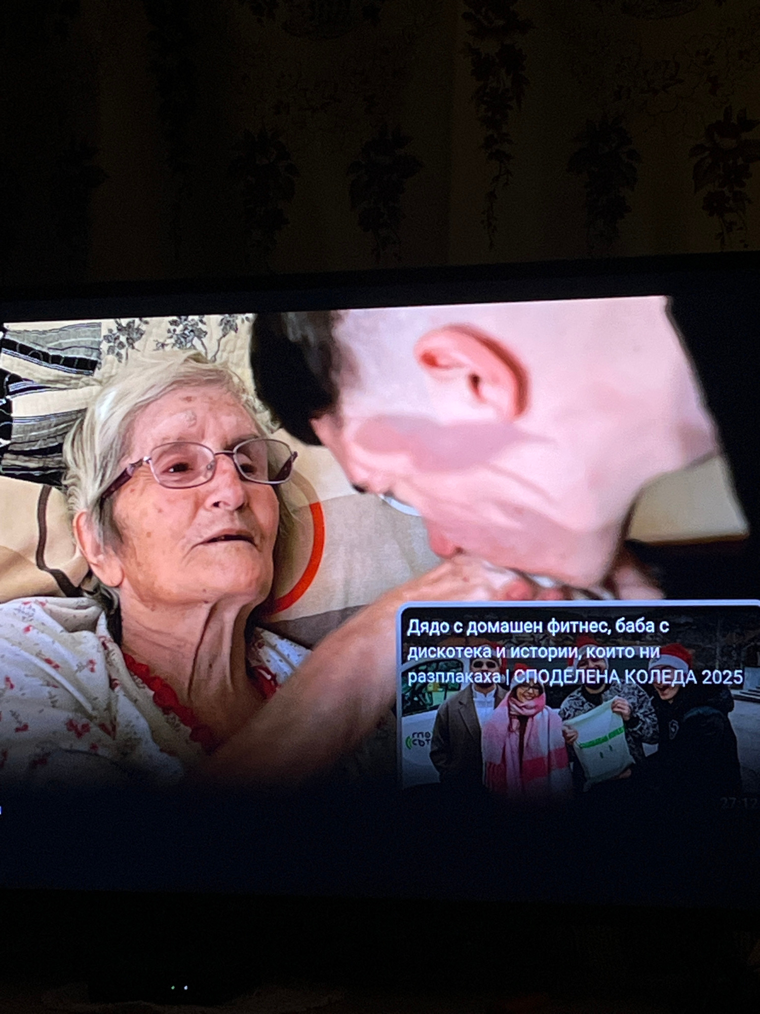The image captures a screen displaying a scene with an elderly woman wearing glasses, lying down on a patterned surface, possibly a bed. Above her is the face of a younger person. On the right side of…read more