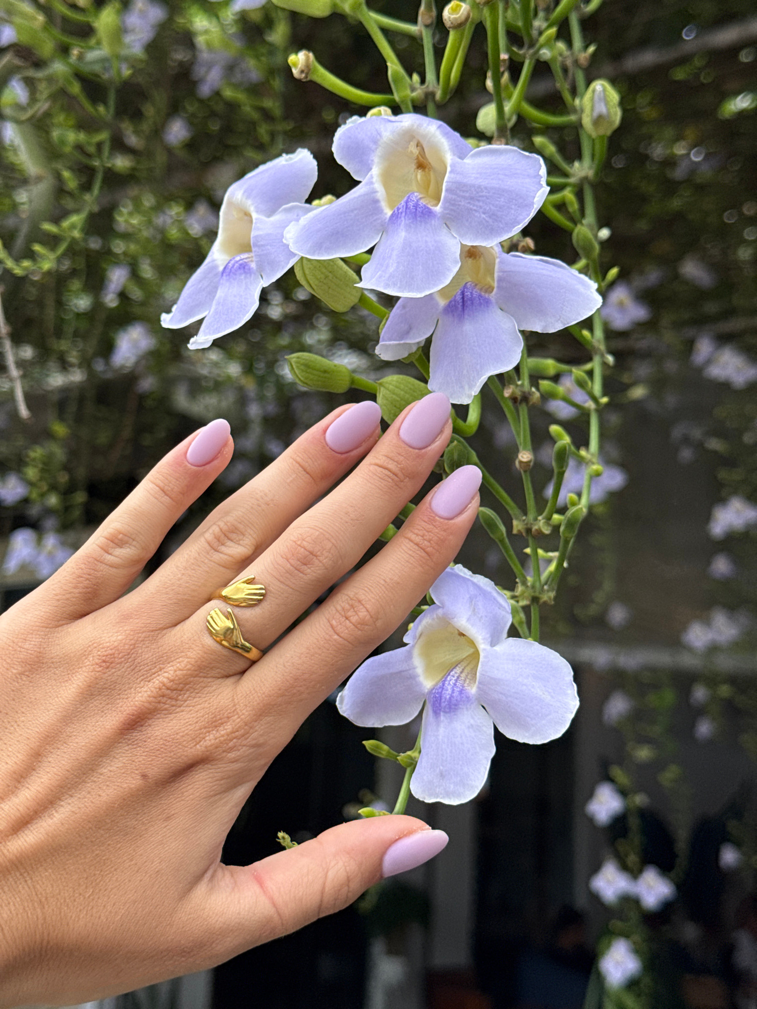 A hand with manicured nails painted a pale lavender is positioned among flowering vines in North Kuta, Indonesia. The ring on the middle finger is gold-toned and depicts two hands embracing. The flowe…read more