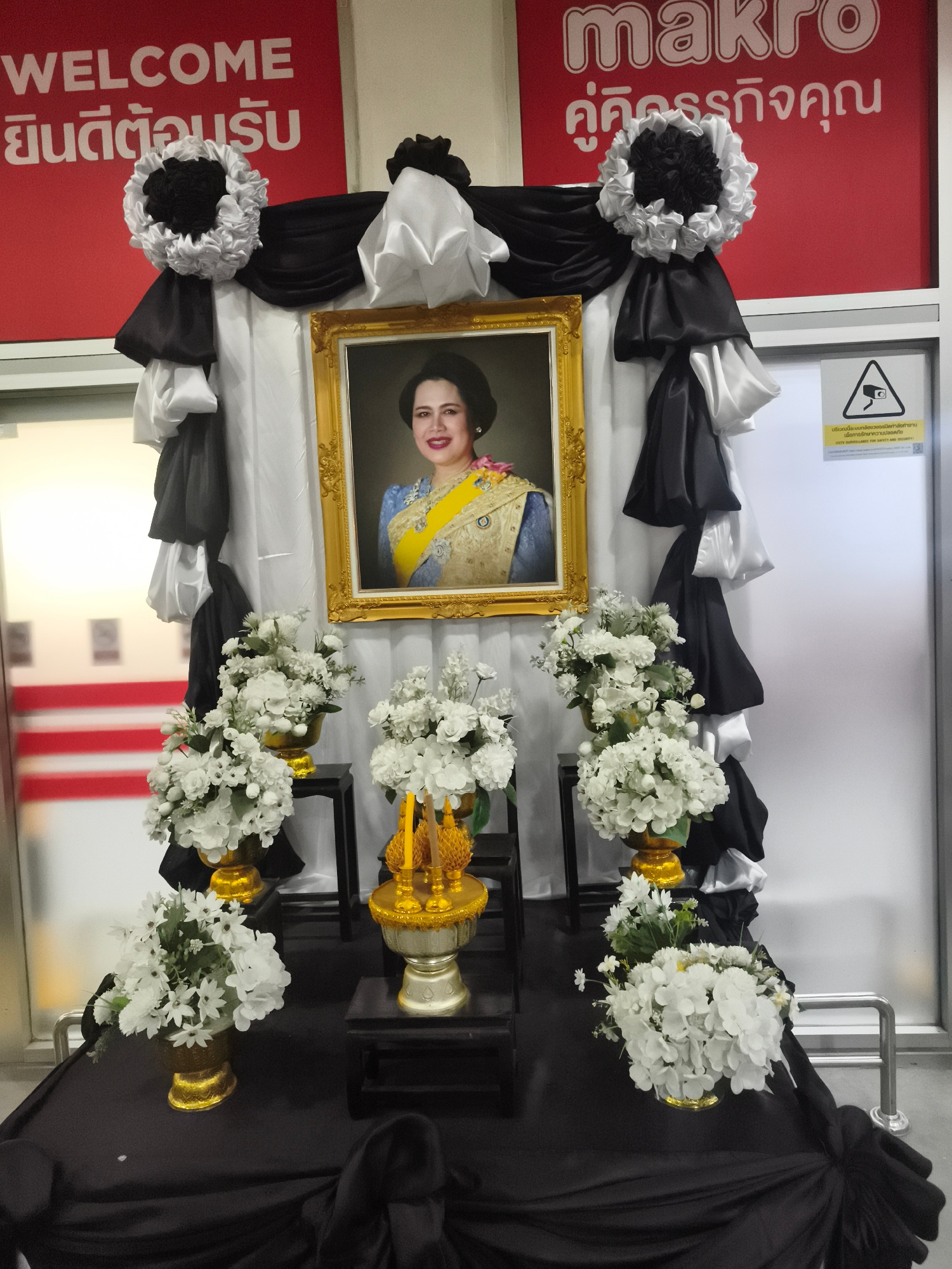 The image depicts a memorial setup for a deceased individual, likely of Thai origin, based on the Thai script present. A framed portrait of the individual is centered within an archway draped with bla…read more