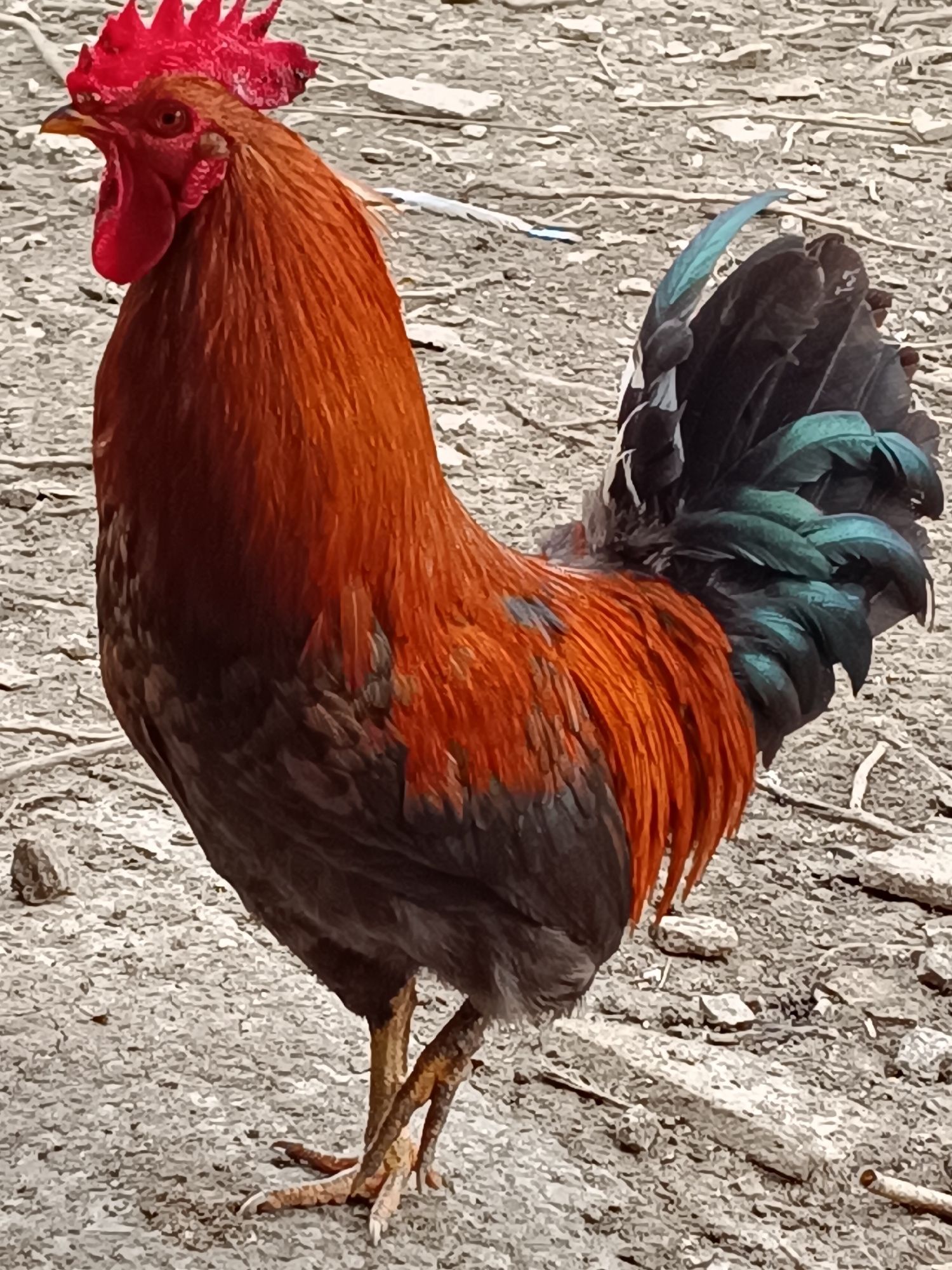 A full-body shot of a rooster standing on what appears to be a dirt or gravel ground. The rooster has a vibrant red comb and wattle, with red and orange feathers on its neck and upper body. The lowerβ¦read more