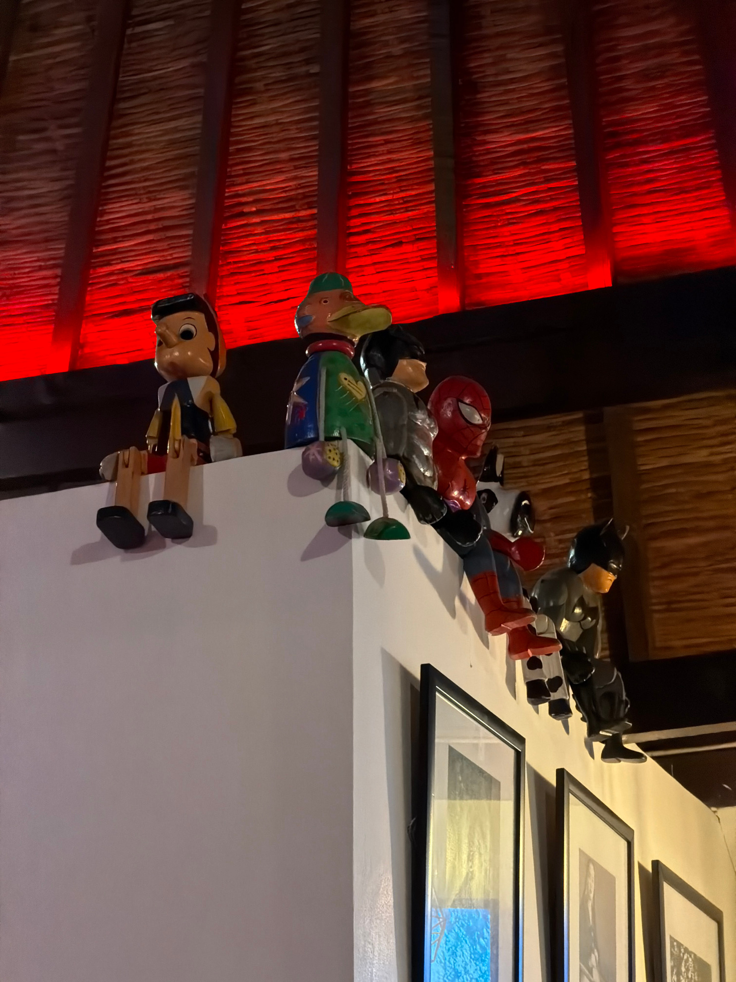 A still life photo shows a white ledge, likely a shelf, hosting a collection of character figurines and framed pictures. Starting from the front, a Pinocchio doll, wooden with movable limbs, stands onโฆread more