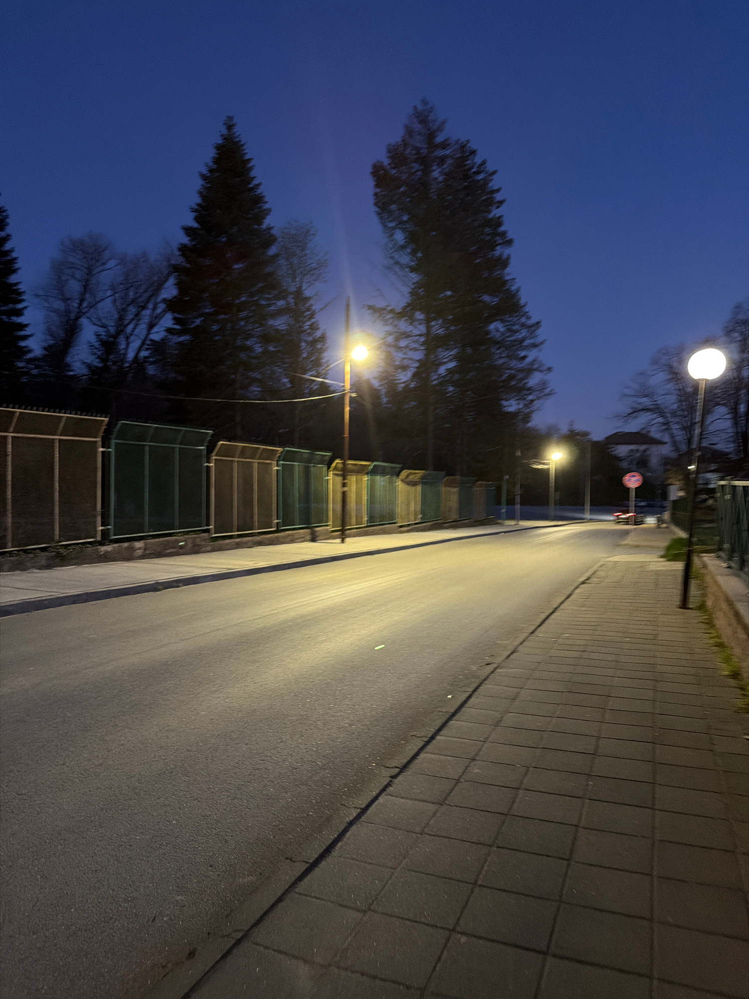 The image depicts an outdoor scene at night in Panagyurishte, Bulgaria. The foreground shows a paved road and a sidewalk made of rectangular tiles. Streetlights illuminate the road, casting a strong l…read more