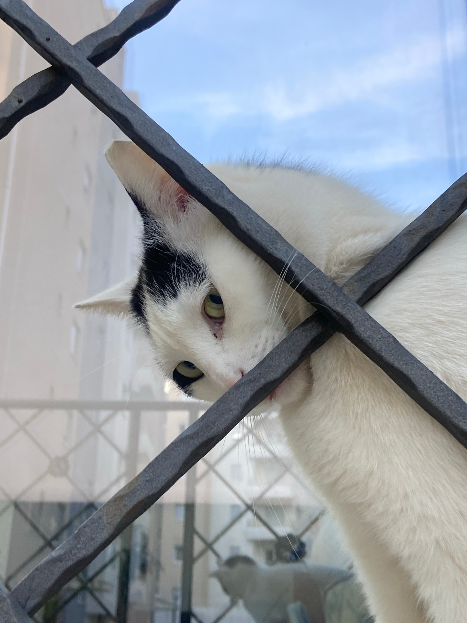 A white cat with black markings is looking down from behind a dark gray, possibly wrought iron, fence. The cat's head is positioned near the center of the frame, with its body extending upwards behind…read more