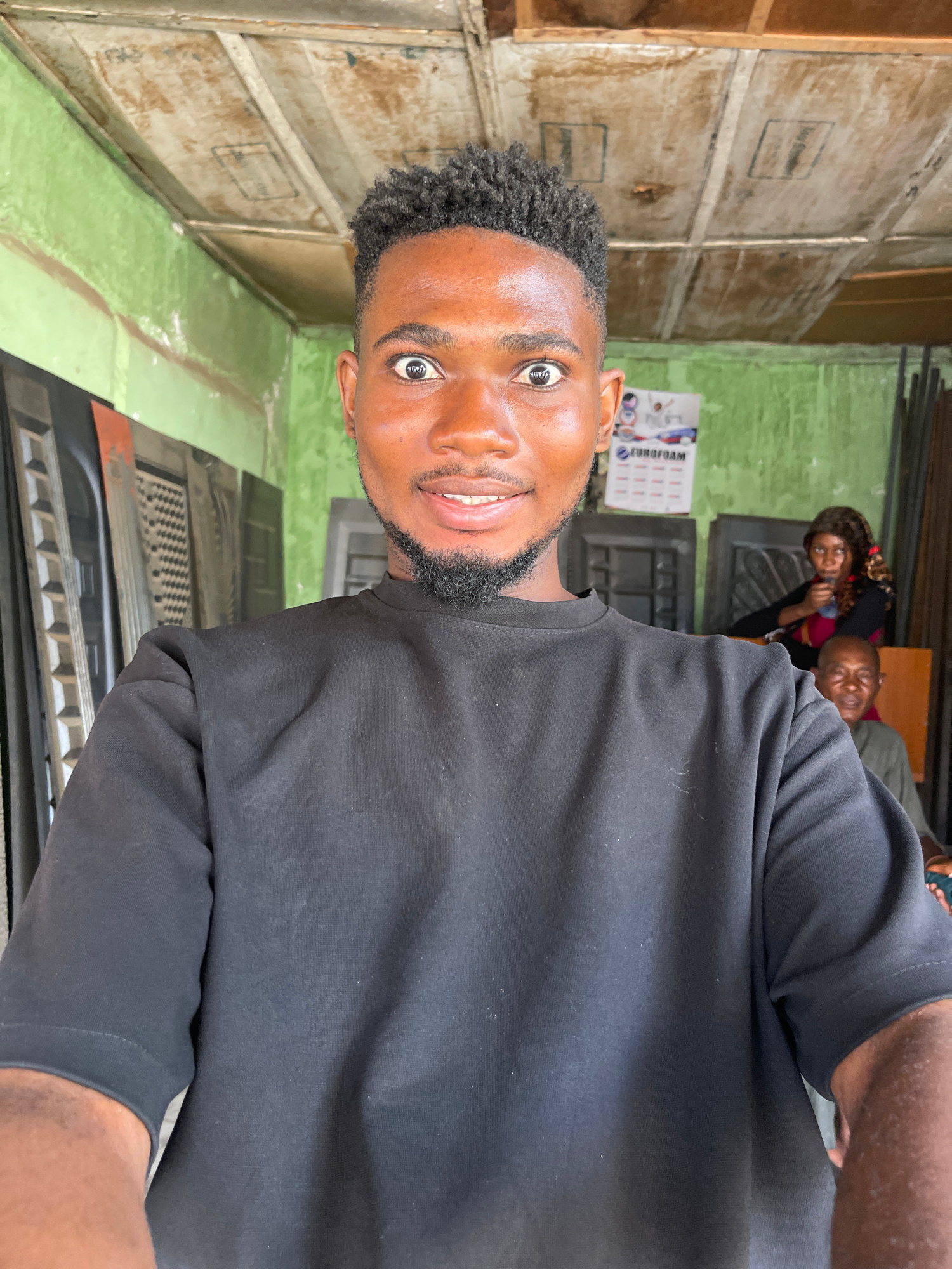 A portrait-style shot captures a young Black man looking directly at the camera with a bright smile. He has short, curly dark hair and a trimmed beard, and is wearing a plain black long-sleeved shirt.…read more