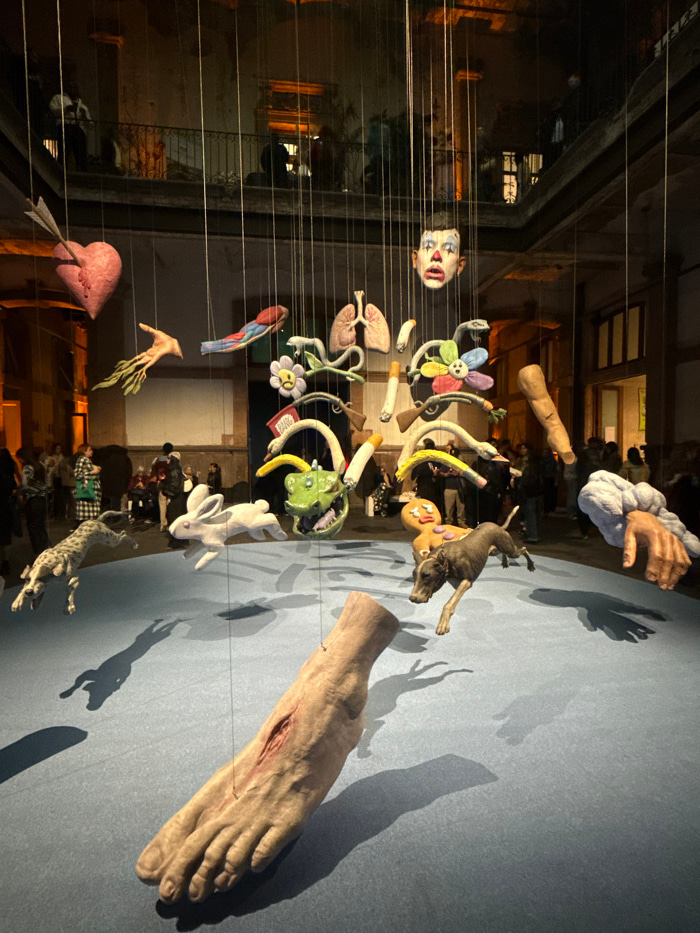 The image shows an indoor art installation. Numerous objects, including a disembodied clown face, internal organs, a cigarette, flowers, a dog, a rabbit, and a heart pierced by an arrow, are suspended…read more