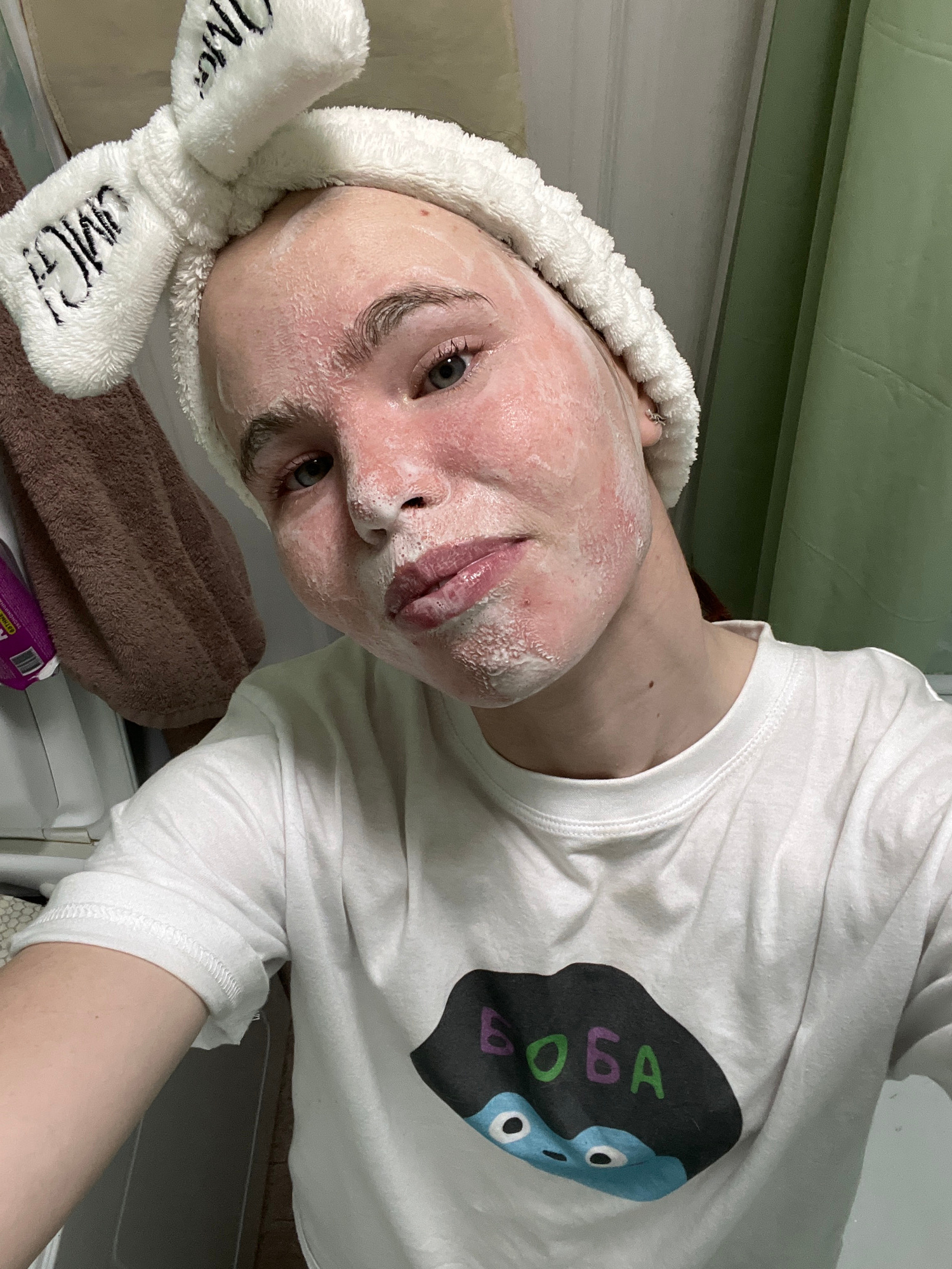 A person is pictured indoors, possibly a bathroom, in a selfie shot. The person has a white headband with bunny ears on their head. The headband has "OMG" embroidered on the ear. The person has a whit…read more