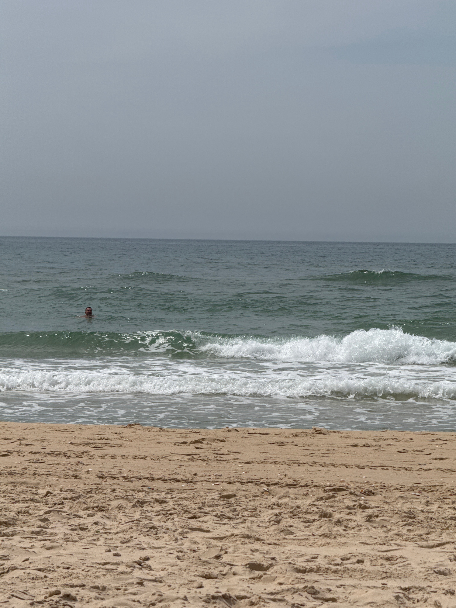 The image depicts a beach scene in Bat Yam, Israel, with the sand on the right, the sea in the center, and the sky on the left. A single person is visible in the water, situated within the ocean. Wave…read more
