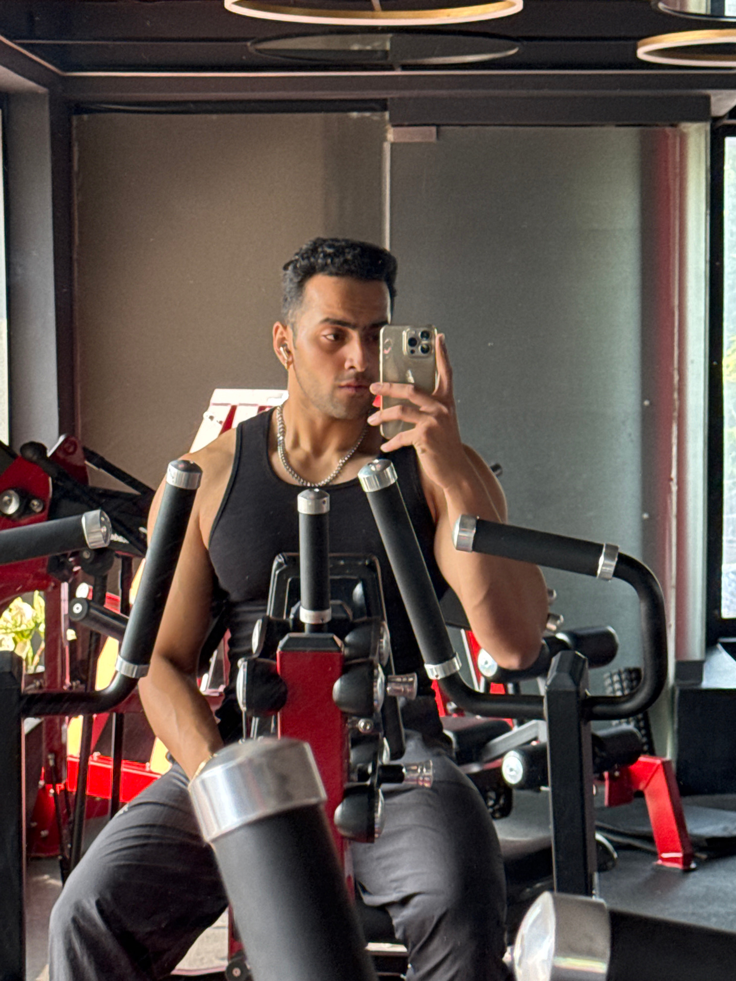 A medium shot of a man in a gym in Kolkata, India, is reflected in a mirror. He holds a smartphone in his left hand, taking a selfie. He is wearing a black tank top and a silver necklace. The gym equi…read more