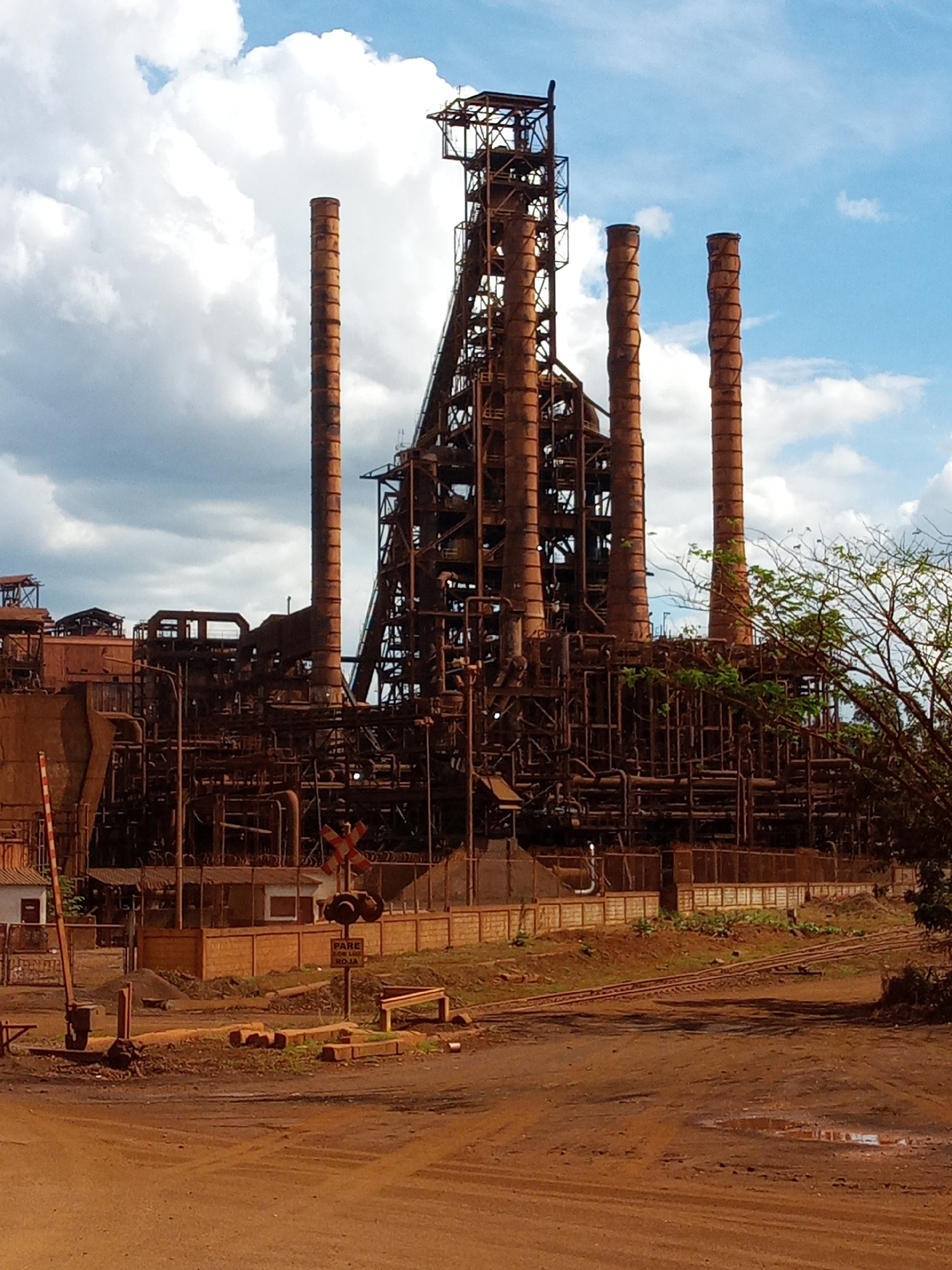 The image depicts a large, rusty steel plant under a partly cloudy sky. The plant consists of tall, cylindrical chimneys, a multi-tiered structure of metal beams and pipes, and various industrial buil…read more