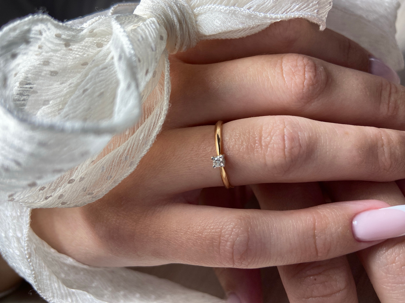 The image depicts a person's hands with a gold ring on the finger. The ring has a small diamond setting. The fingers are intertwined, and a white, textured fabric is draped around the hands. The nails…read more