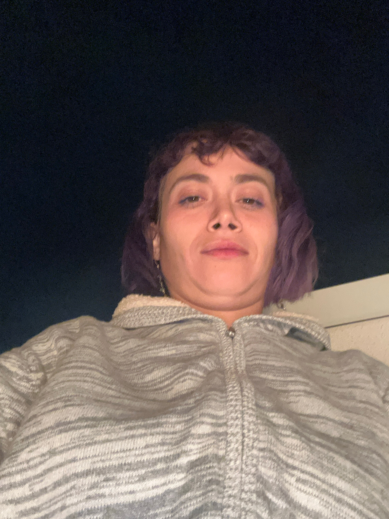 A low-angle, head-and-shoulders portrait captures an adult female with light skin and wavy, shoulder-length purple hair, including bangs. She looks directly at the camera with a neutral expression, di…read more