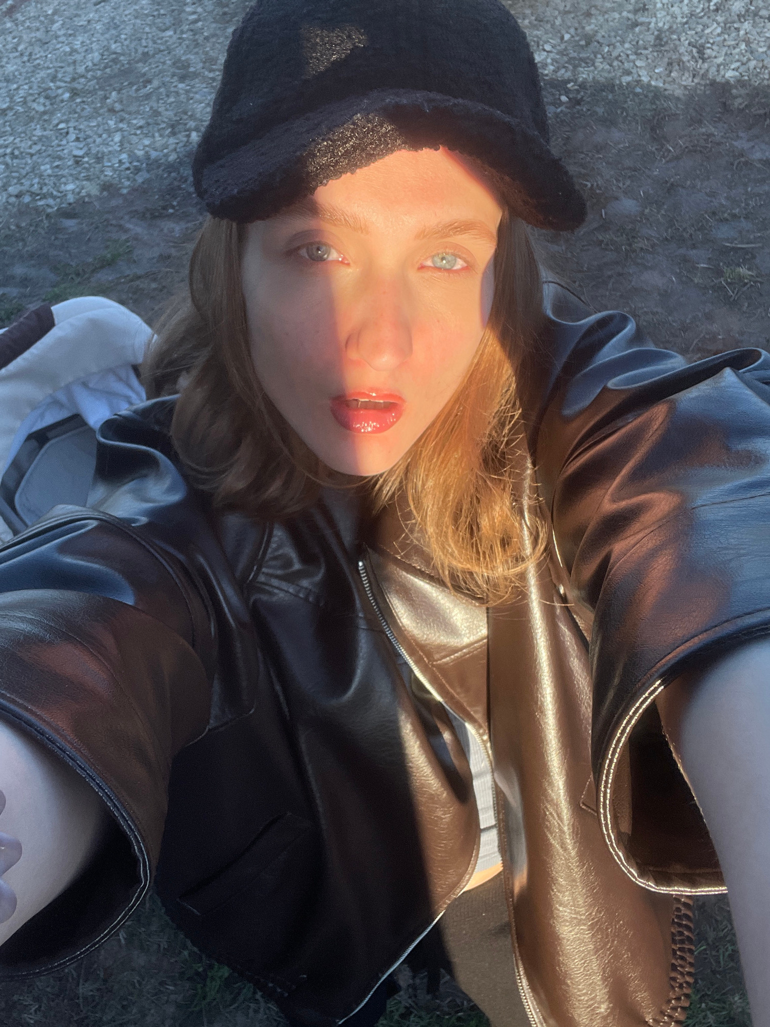The image is a close-up, high-angle selfie of a young woman, taken outdoors in Podshivalovo, Russia. Her face is framed by light-colored hair and features striking blue eyes and glossy, red-tinted lip…read more