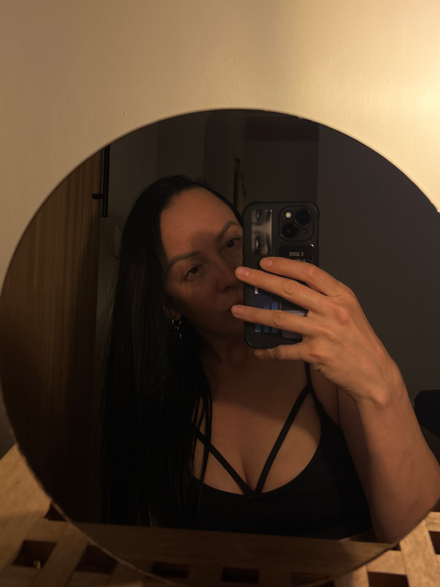 The image shows a person taking a selfie in a round mirror. The person is holding a black smartphone in their right hand, obscuring part of their face. The phone case has a sticker with a pair of eyes…read more