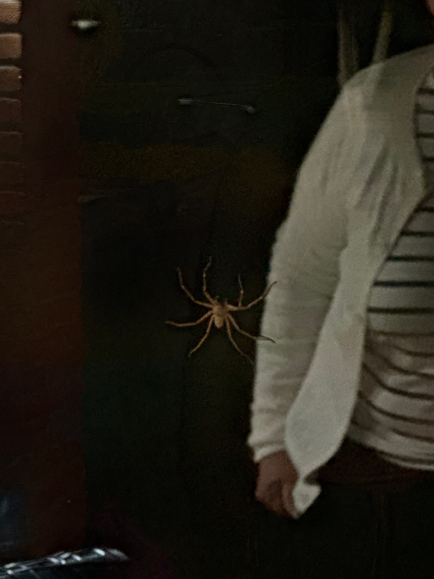 A medium-sized, tan spider is present on a dark surface, possibly wood, near a white fabric with vertical stripes. The location is not discernible in the image, and there is no way to determine if it…read more