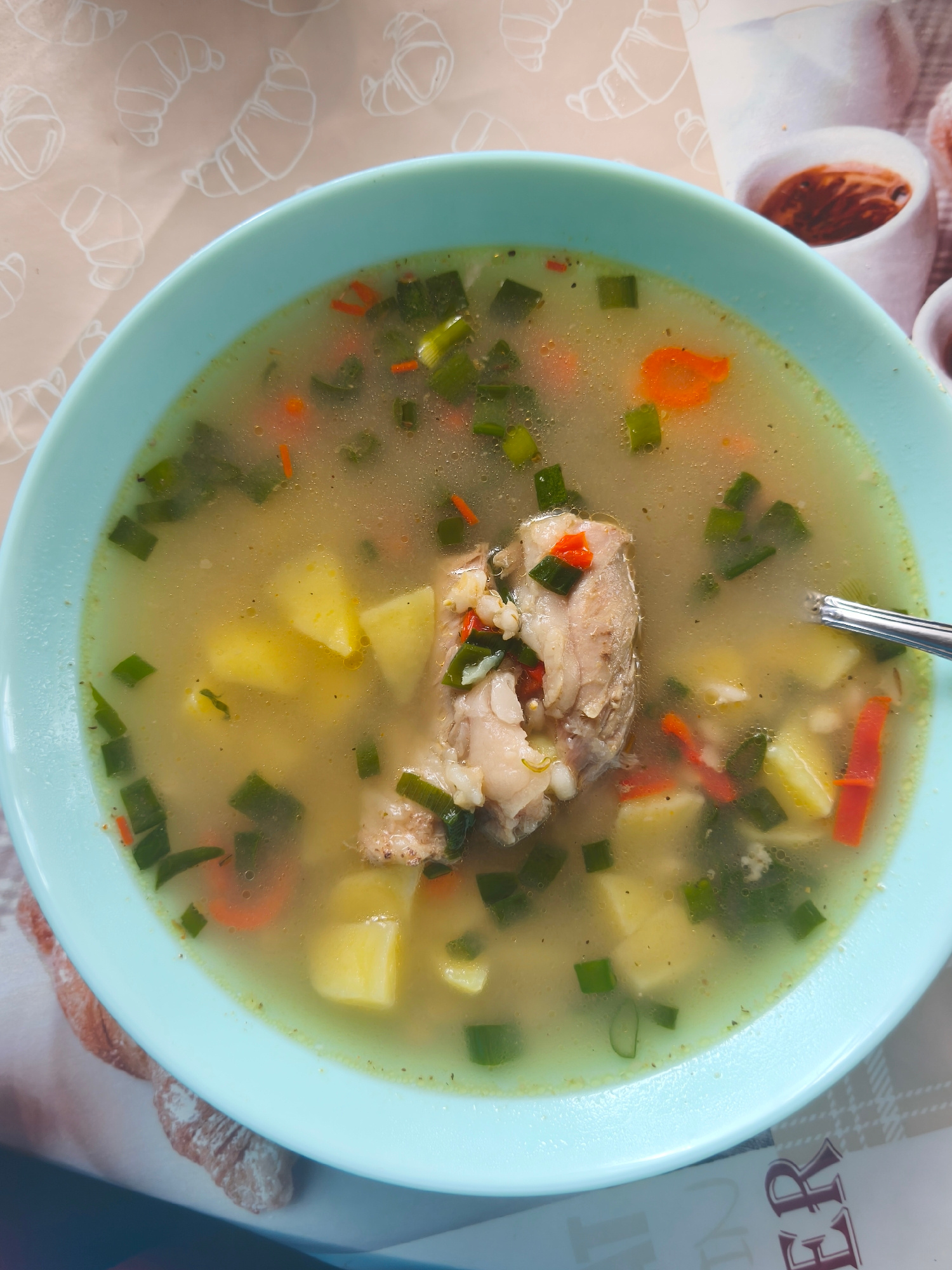 A top-down shot shows a light blue bowl of chicken soup. The soup contains chicken pieces, diced potatoes, carrots, and green onions in a broth. A silver spoon is visible in the soup on the right side…read more