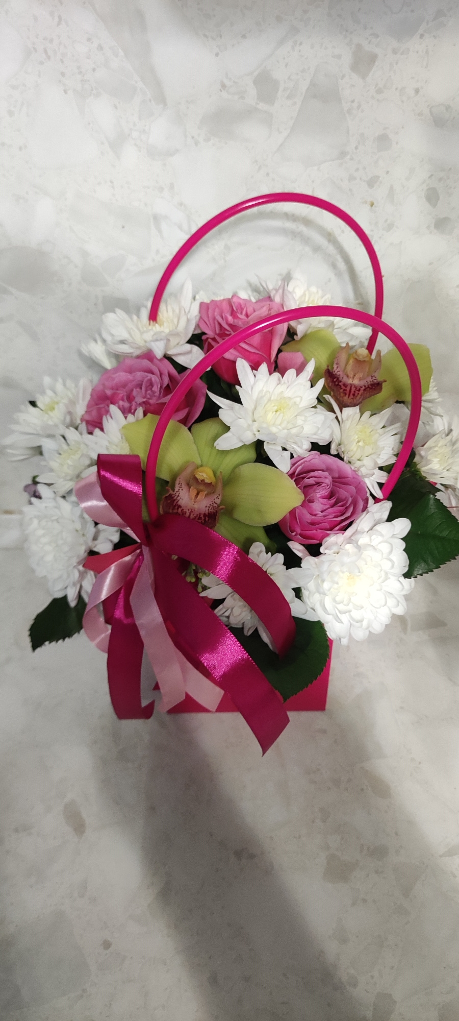 A bouquet of flowers is positioned in a bright pink container with matching handles. The flowers include white chrysanthemums, pink roses, and green orchids. A pink ribbon is tied in a bow around the…read more