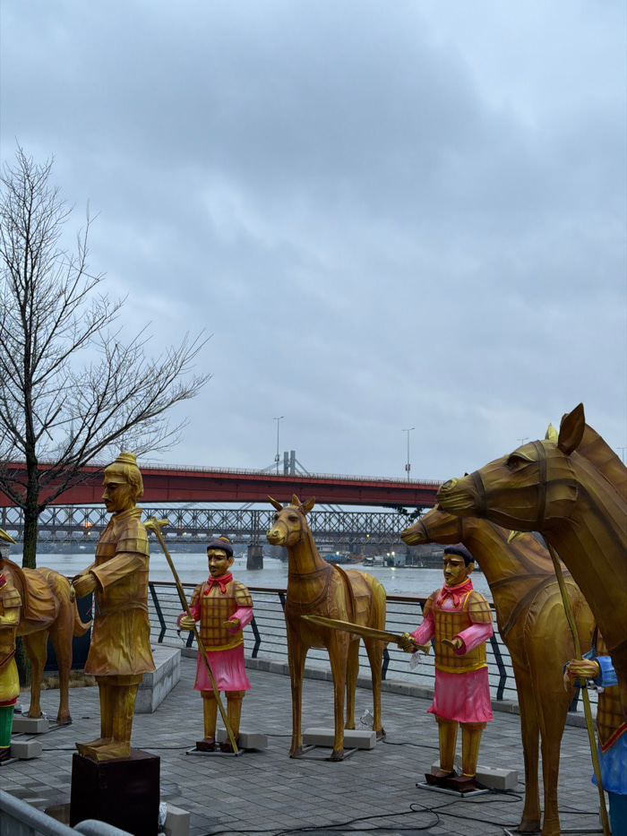 Terracotta Army-inspired lanterns line a waterfront promenade beneath a steel bridge and overcast sky. The golden-hued figures, depicting warriors and horses, stand in a row. Some figures wear pink tu…read more