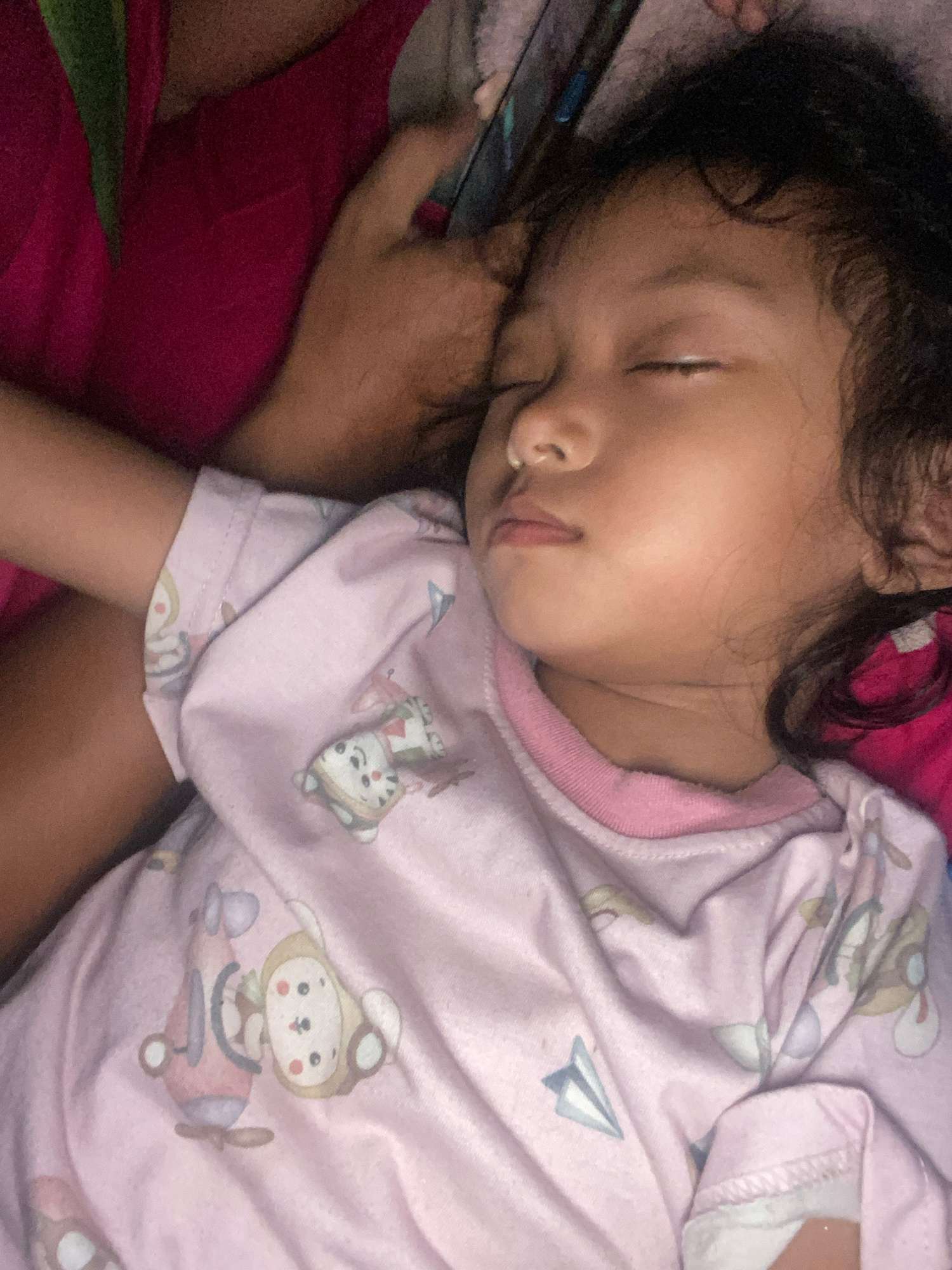 A child is sleeping on a bed. The child is lying on their side, facing the left of the frame. They are wearing a pink top with cartoons printed on it. A hand, presumably belonging to an adult, is hold…read more