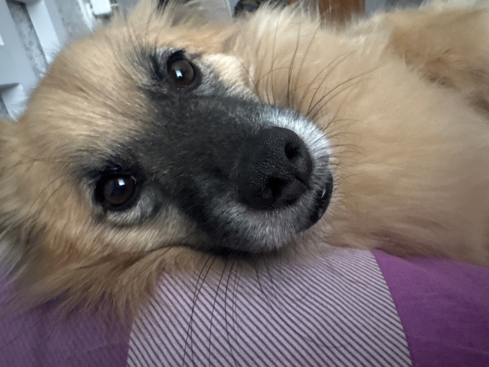 A close-up shot features a light brown, fluffy dog with a black nose and dark eyes resting on a purple and white striped surface, likely a pillow or blanket. The dog's head is tilted towards the camer…read more