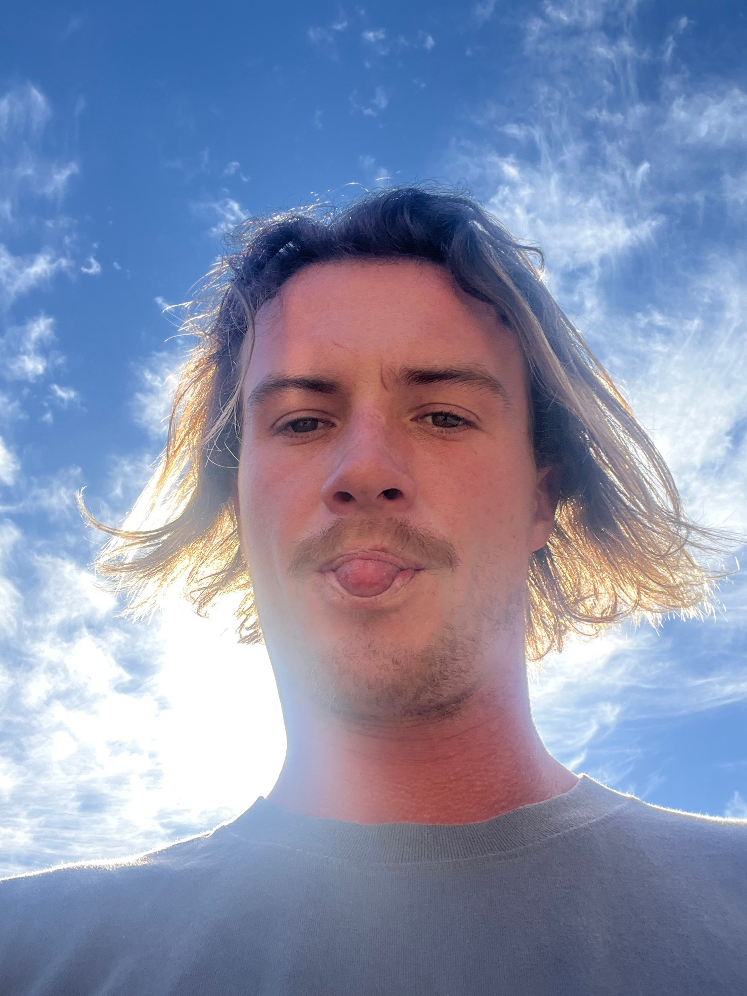 A man with blond hair, wearing a gray t-shirt, is looking down at the camera, sticking his tongue out. The background is a bright blue sky with wispy white clouds. The location is Bellambi, Australia.