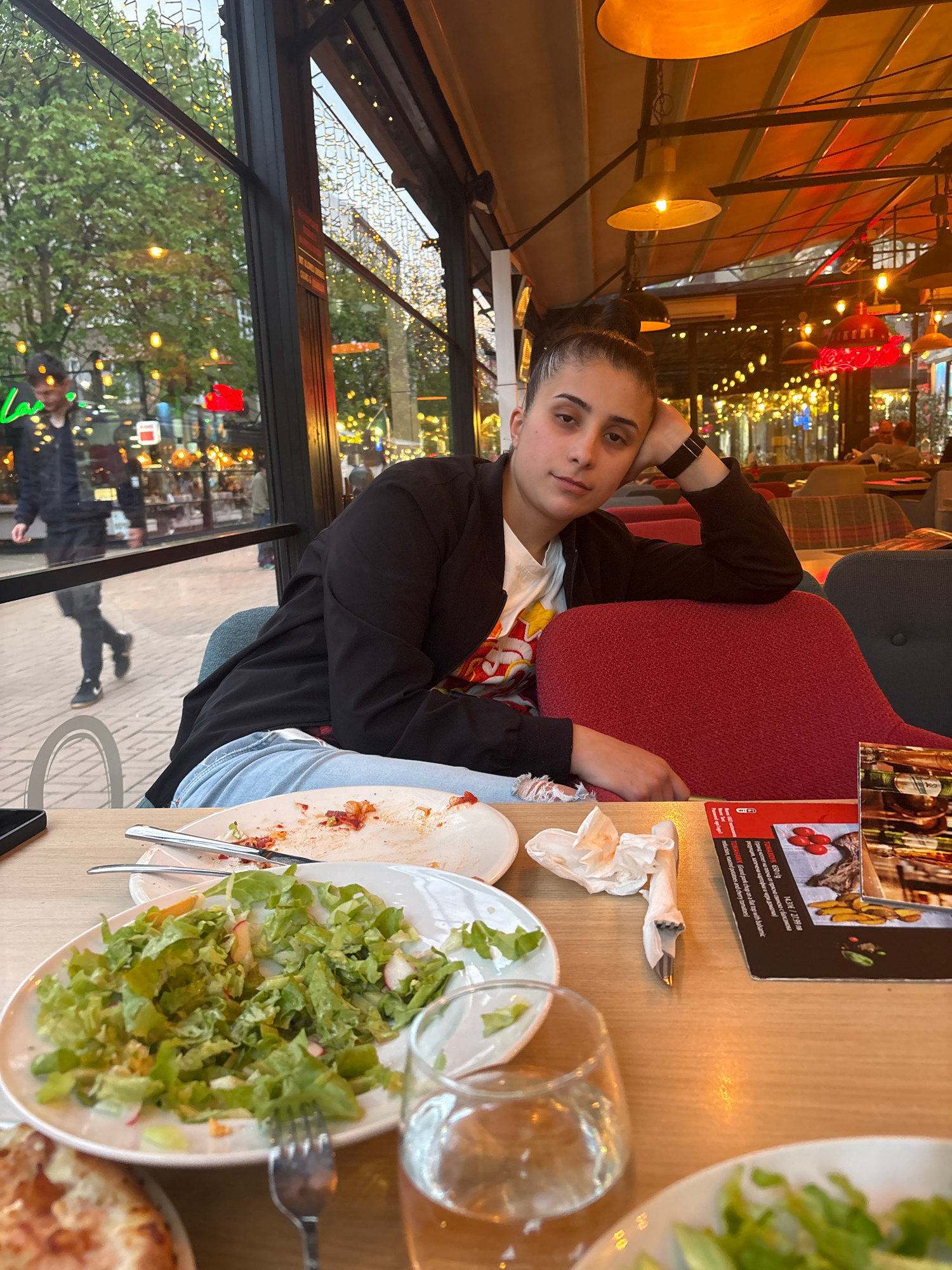 This is an eye-level, horizontal photograph of a young individual seated at a wooden dining table in what appears to be a restaurant or cafe in Sofia, Bulgaria, during the evening. The person, with da…read more