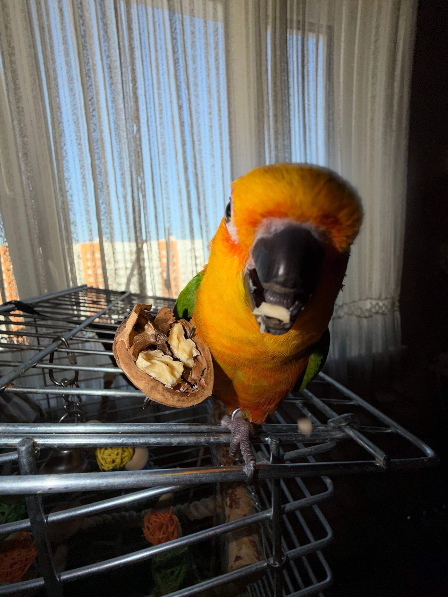 A low-angle, indoor shot presents a sun conure parrot eating a walnut half. The parrot, primarily orange and yellow with some green, is perched on a metal cage. The walnut half is positioned near the…read more