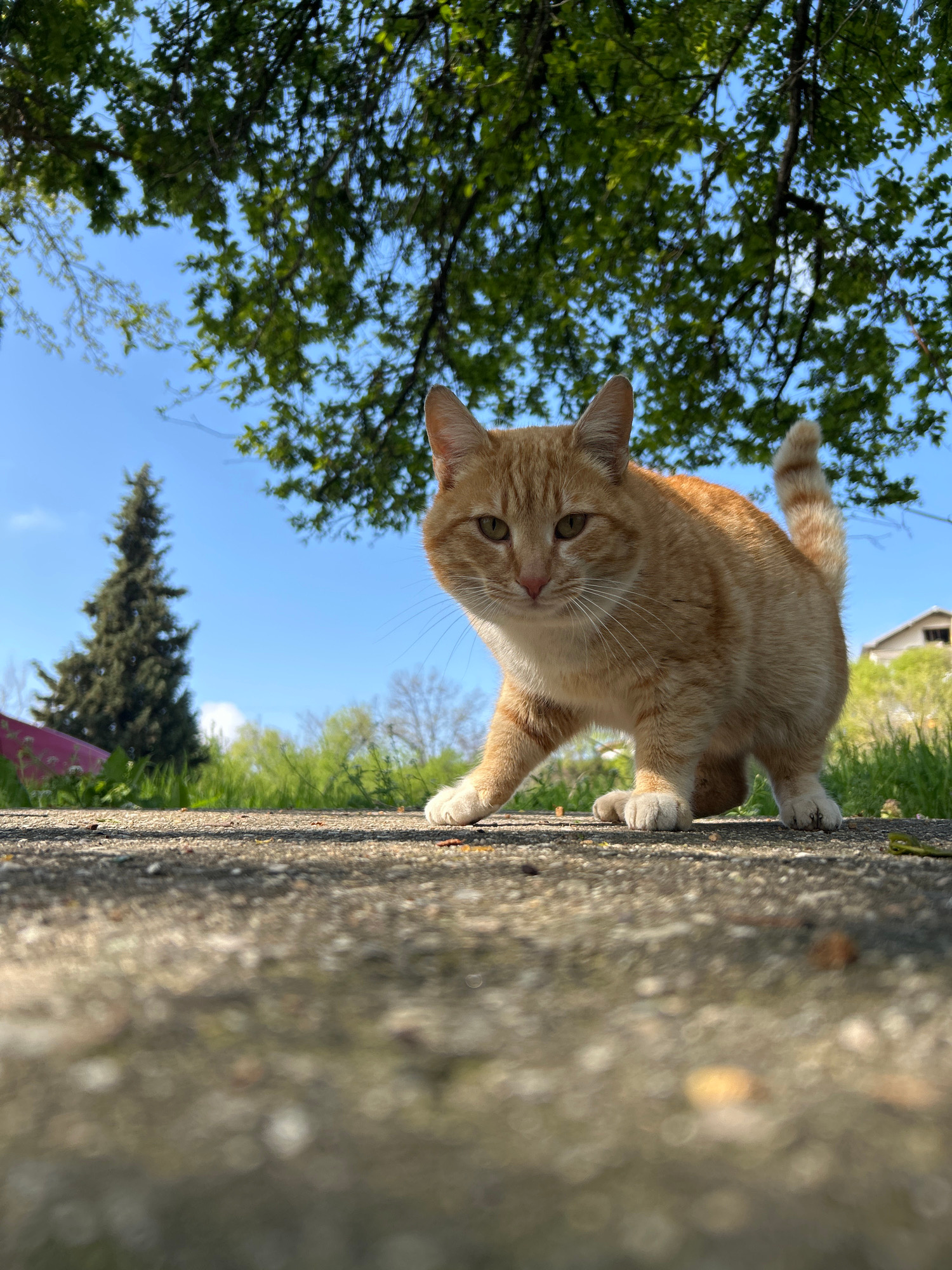 A close-up, low-angle photograph depicts a ginger cat perched on a grey stone wall. The cat is in the foreground, looking down with its paws gripping the edge of the wall. Behind the wall, the backgro…read more