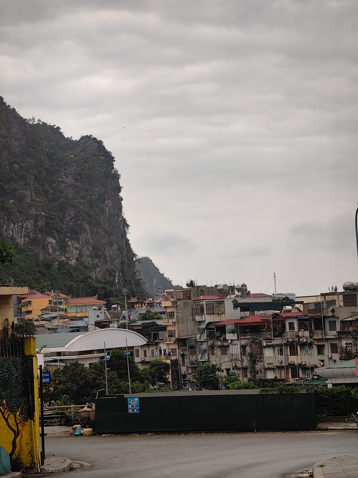 The scene is an overcast cityscape within Hong Gai Ward, Vietnam. A steep, rocky, tree-covered mountain rises abruptly on the left side of the frame, dominating the skyline. To the right of the mounta…read more