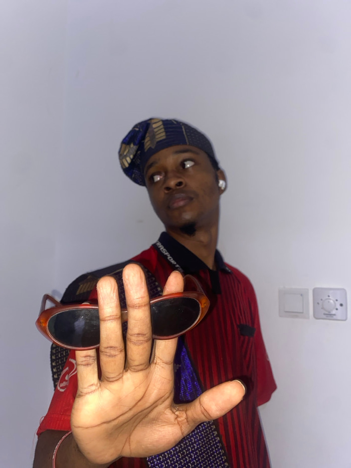 A person wearing a blue and gold head covering and a red and black shirt holds sunglasses in their right hand. The individual gazes up and to the left. Above the person, near the top of the frame, are…read more
