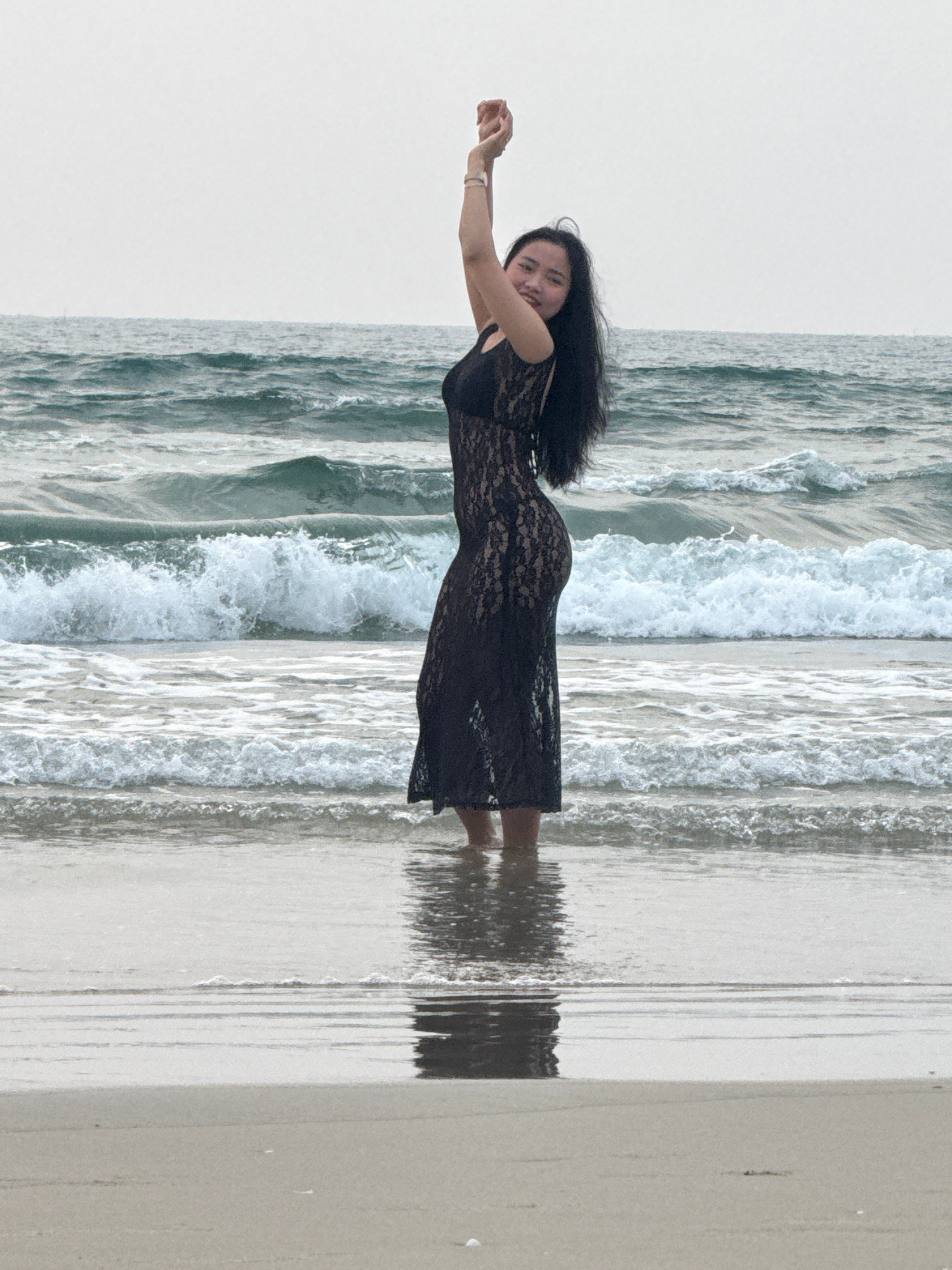 A woman with long, dark hair is seen standing on a beach at Đà Nẵng, Vietnam. She is wearing a black, semi-sheer lace dress. The ocean waves are visible in the background, and her reflection is cast o…read more