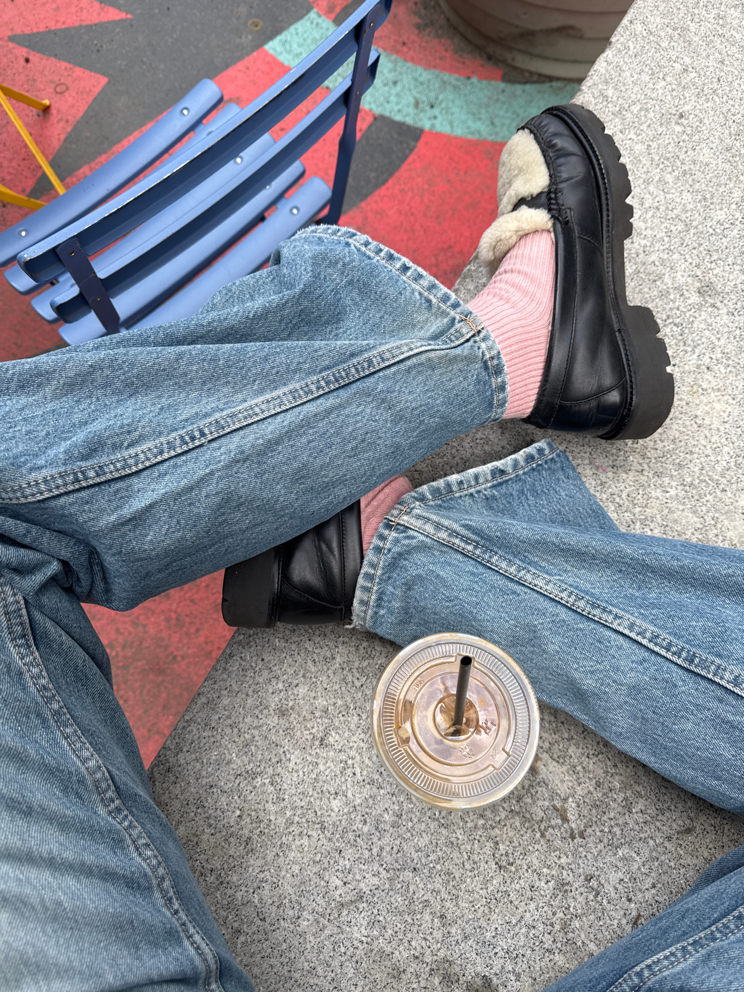 This high-angle, close-up shot captures the lower body of a person sitting outdoors in what appears to be a casual urban setting in New York, United States of America. The subject is wearing light blu…read more