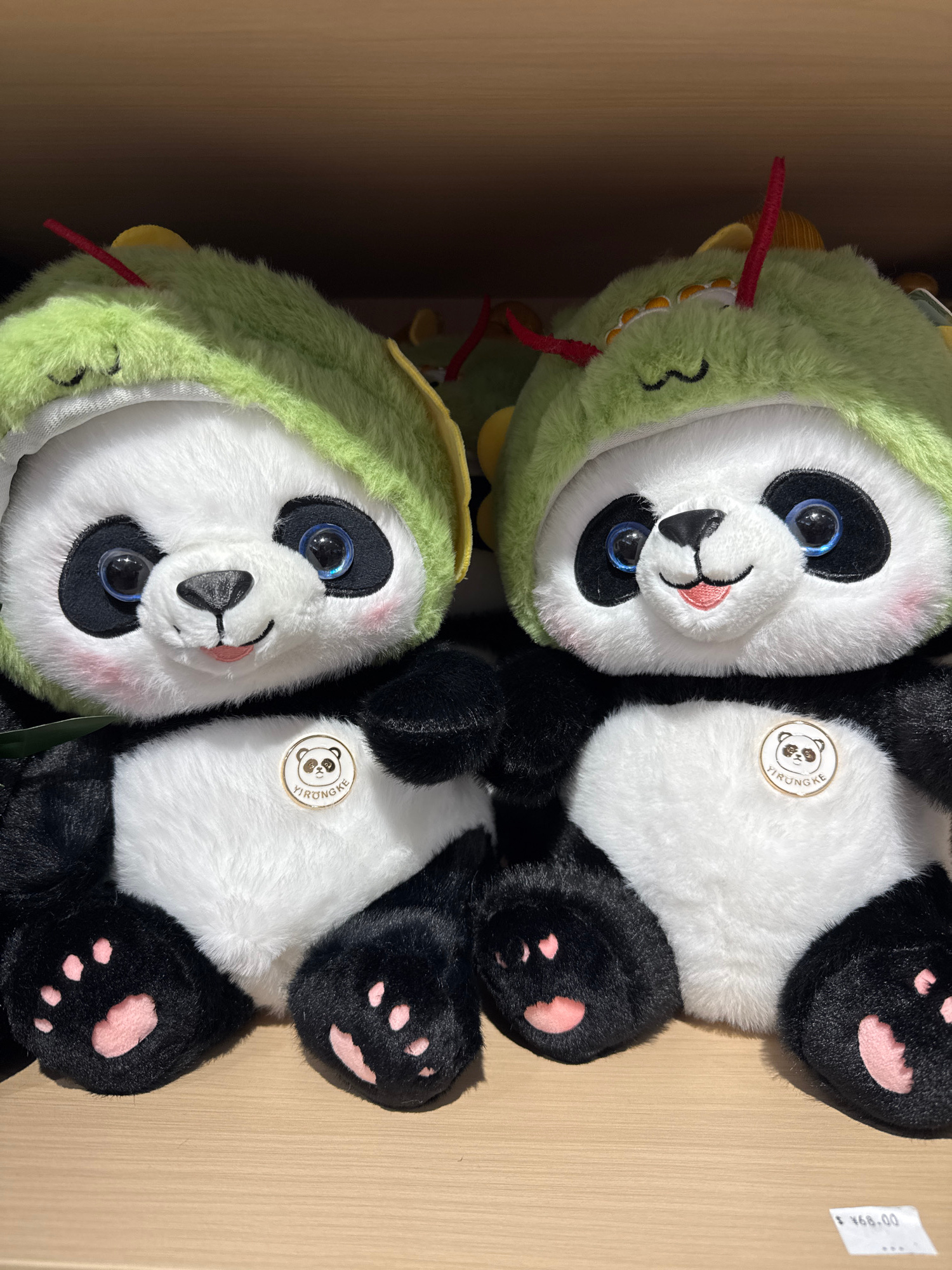 The image shows four plush panda toys in a box. Two are in a dragon costume with green fur. The other two are standard panda bears with a YIRONGKE logo on their chests. A price tag of $68.00 is visibl…read more