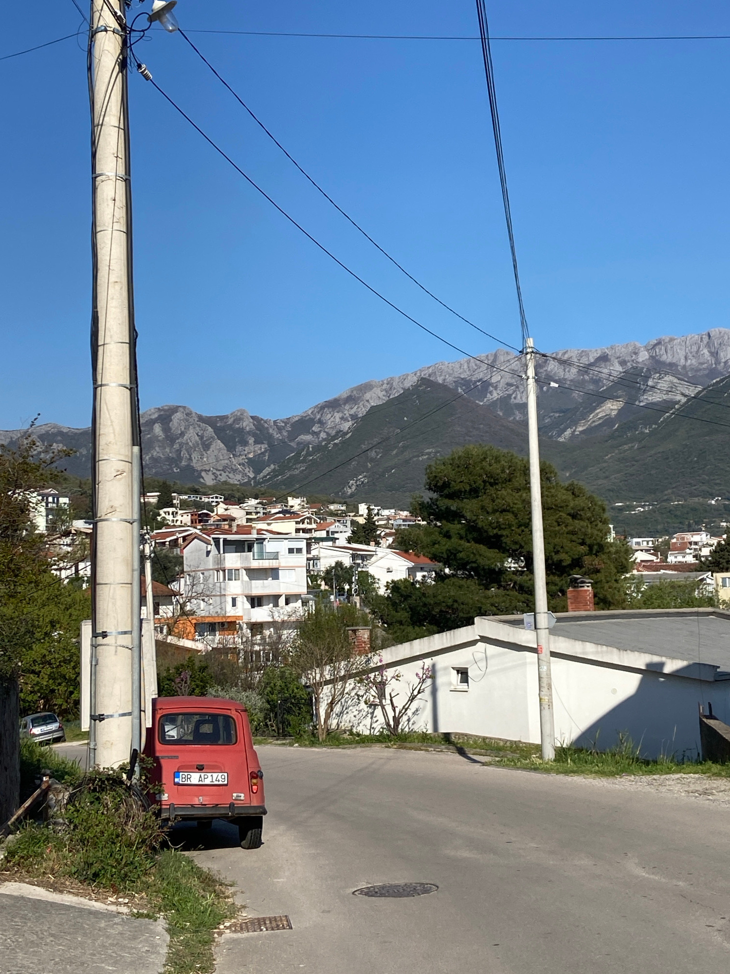 The image captures a street scene in Šušanj, Montenegro. The focus is on a parked, vintage, red car with license plate "BR AP 149", positioned on a paved road partially overgrown with vegetation. To t…read more
