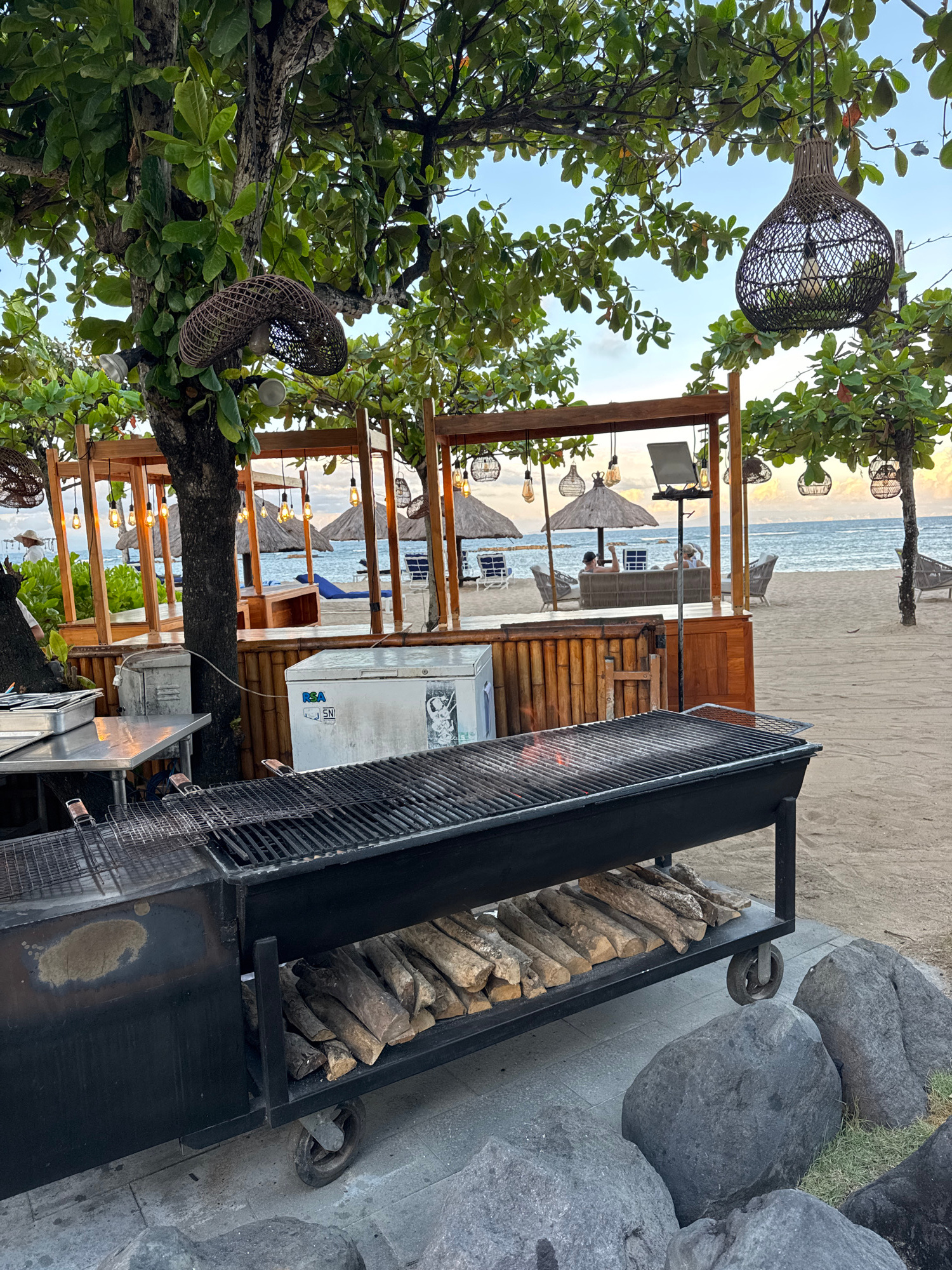 The image depicts an outdoor grilling setup, likely at a restaurant or resort, near a beach in Unknown, Indonesia. A large, black metal grill is prominently featured, with a section filled with logs f…read more
