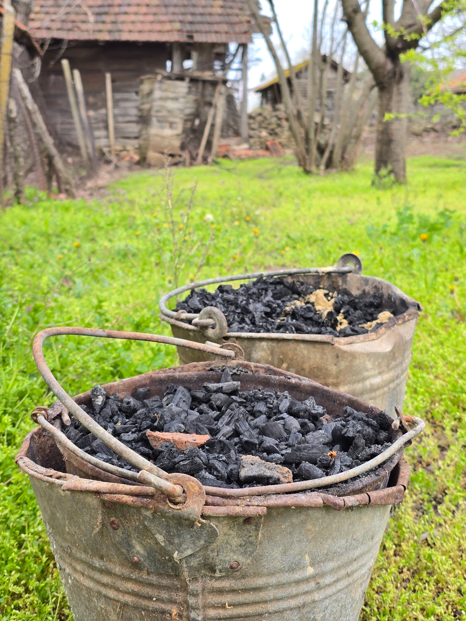 Two galvanized steel buckets sit on green grass outside a dilapidated structure with a tiled roof, possibly in a rural setting. The buckets are filled with what appears to be charcoal or burnt wood. B…read more