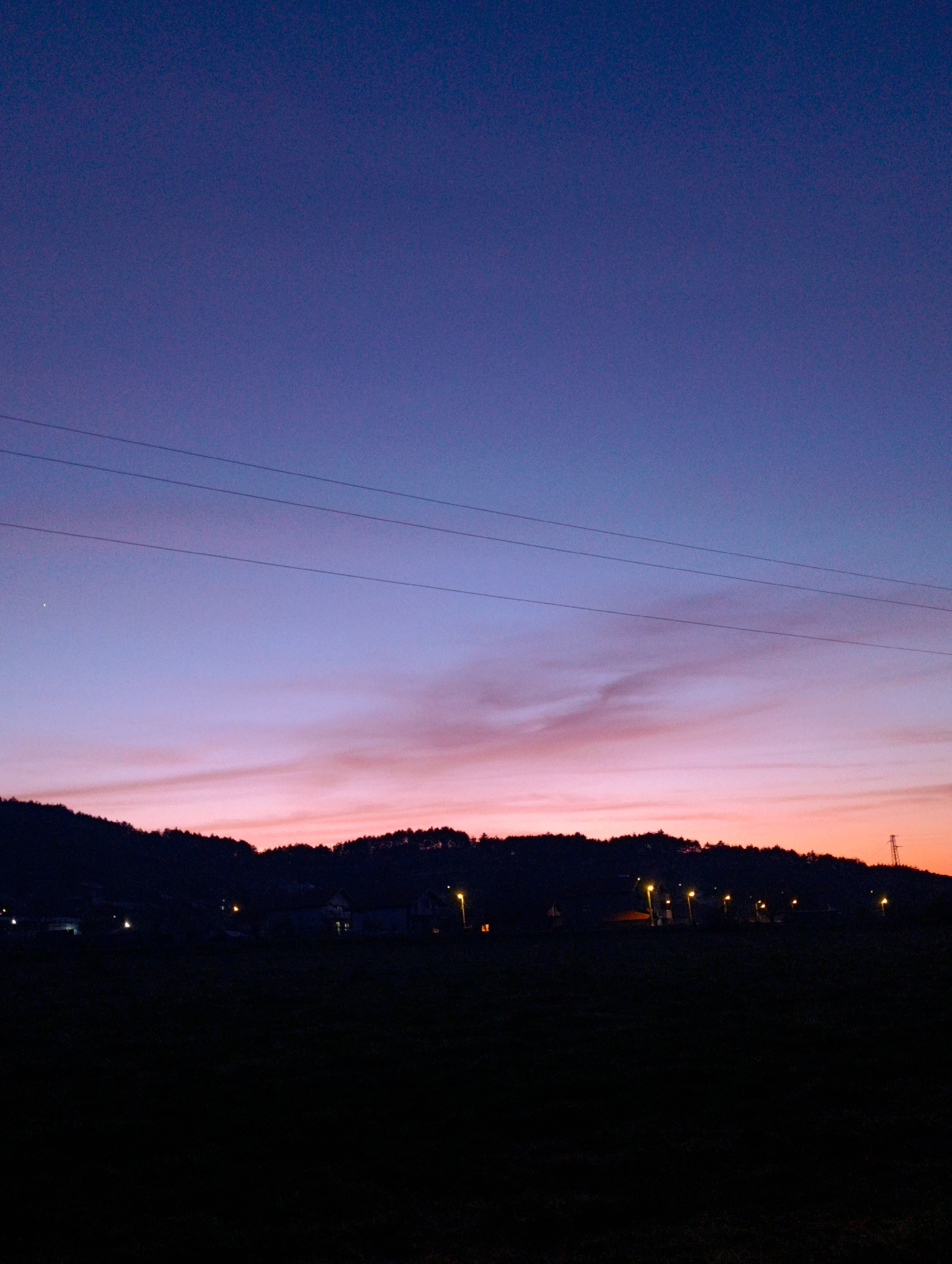 The image depicts a dusk or dawn scene in Shiroko pole, Bulgaria. The sky transitions from a deep blue to a pinkish-orange at the horizon. Three power lines stretch horizontally across the upper porti…read more