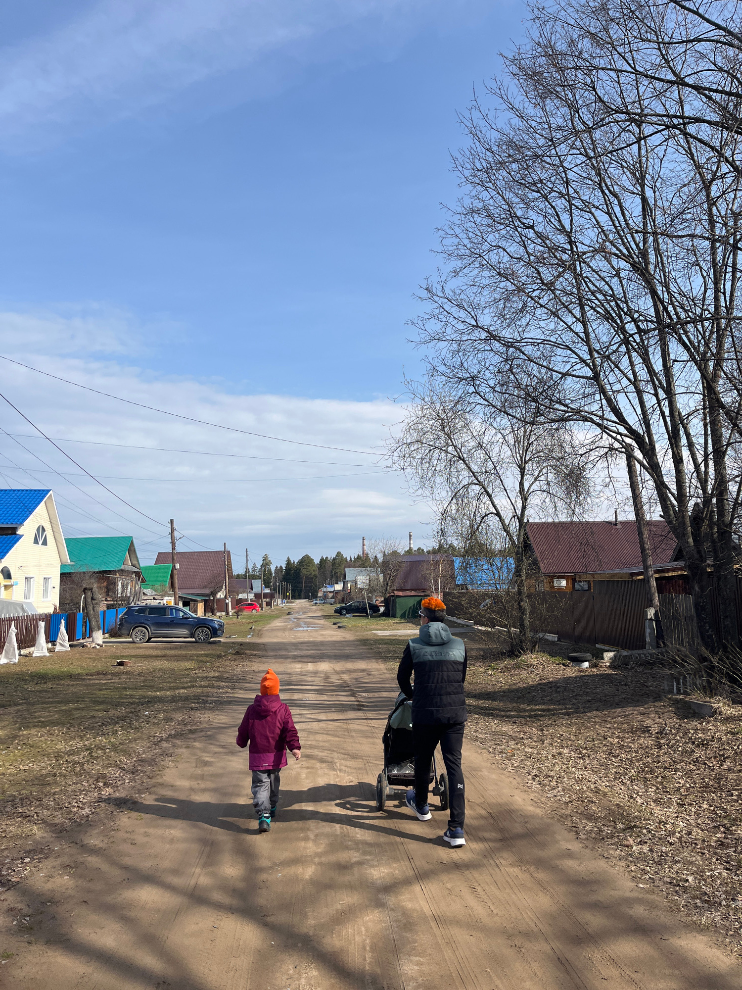 On a dirt road in what appears to be a rural or suburban area of Chaikovsky, Russia, two individuals are walking in the same direction. One person, clad in a dark jacket and dark pants, is pushing a s…read more