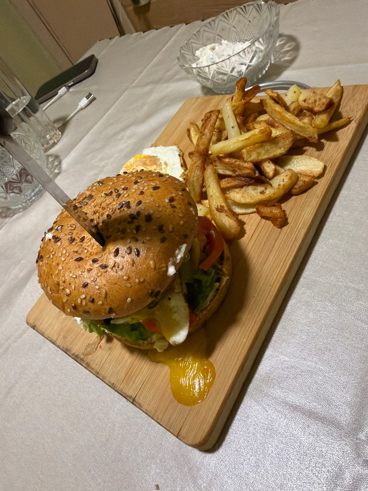 The image depicts a wooden cutting board with food on a textured white surface, likely a tablecloth. On the board, there is a pile of fried potatoes, a cut bagel sandwich with visible lettuce, tomato,…read more