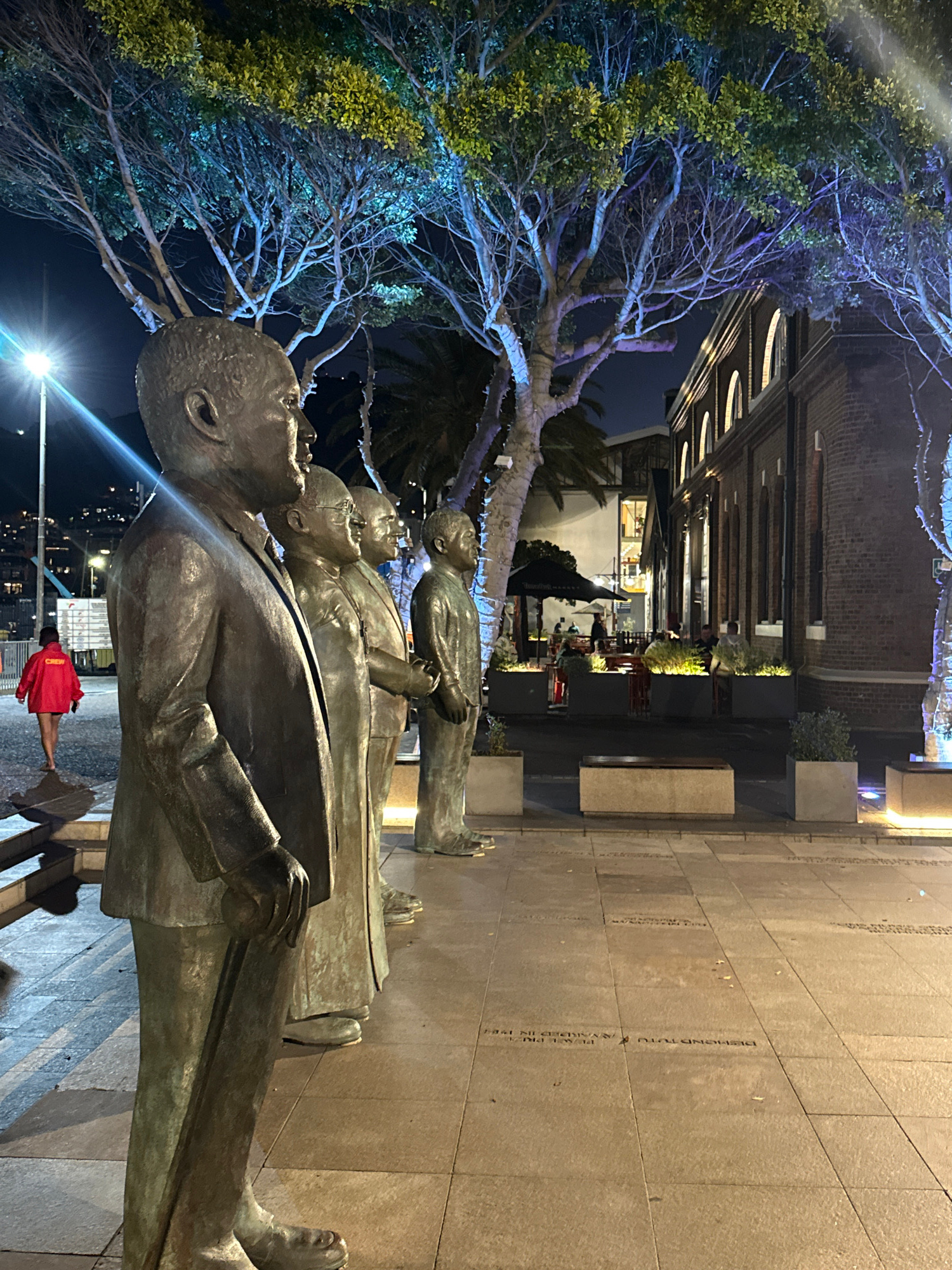 The photograph depicts a bronze statue of several figures in business suits, likely depicting an important moment of people leading to the end of apartheid. The statue is located on a paved walkway inβ¦read more