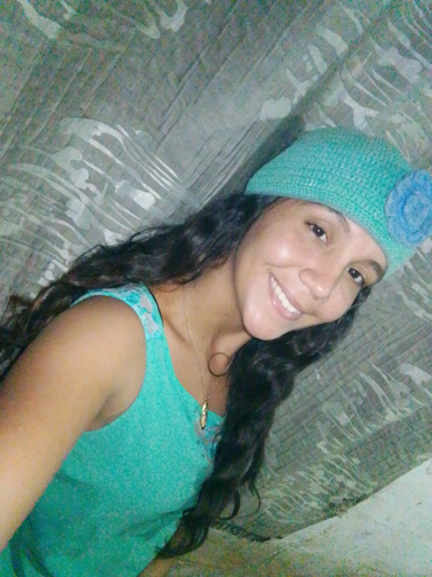 A young woman is pictured from the chest up, smiling. She is wearing a light green tank top and a light green knitted beret with a blue knitted flower accent. She is also wearing a gold necklace. The…read more