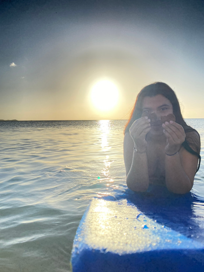 A woman with long dark hair and glasses is in the water. She holds something small in her hands near her face. She's on a blue object, possibly a float or raft. The sun is behind her, creating a brigh…read more