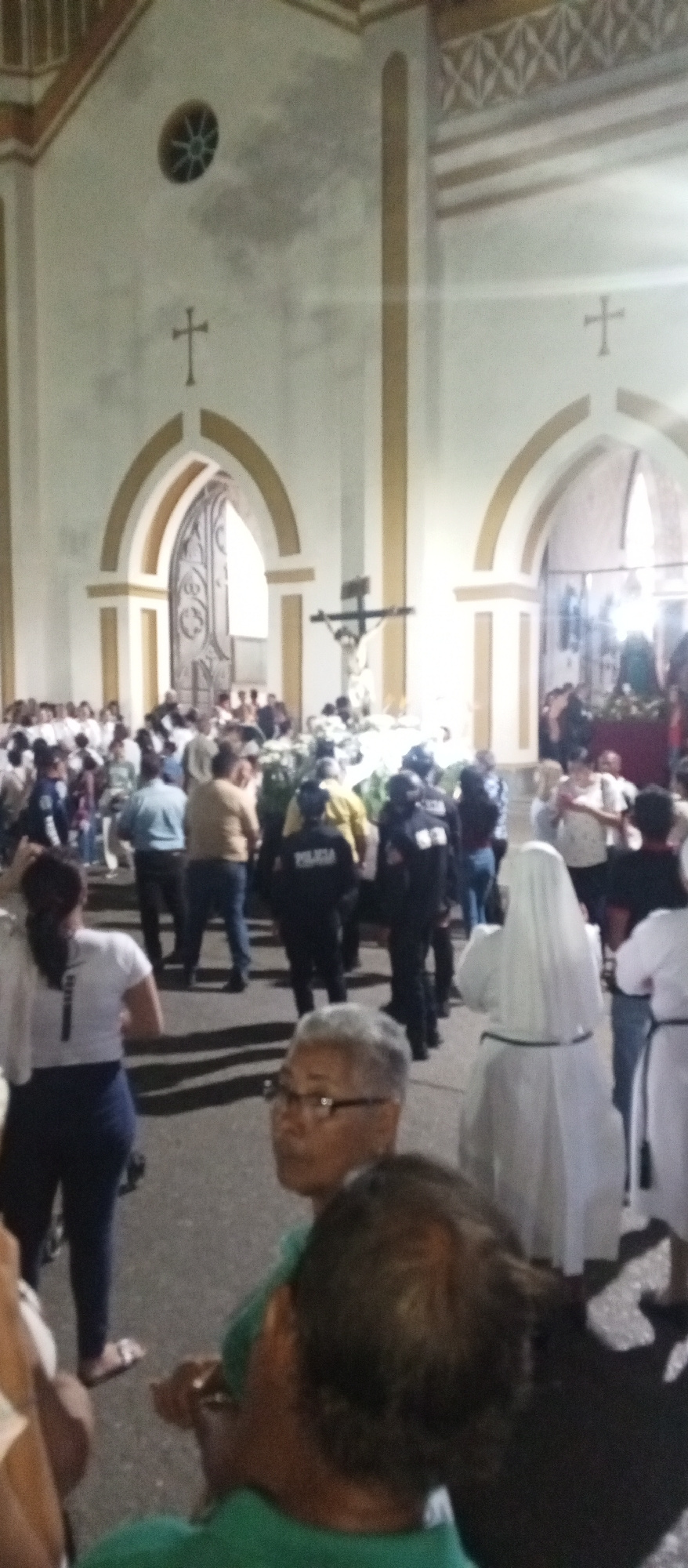 The image depicts a gathering of people outside a church in Tinaquillo, Venezuela. The church facade is visible with arched entrances and crosses above. A crowd of people, including some wearing white…read more