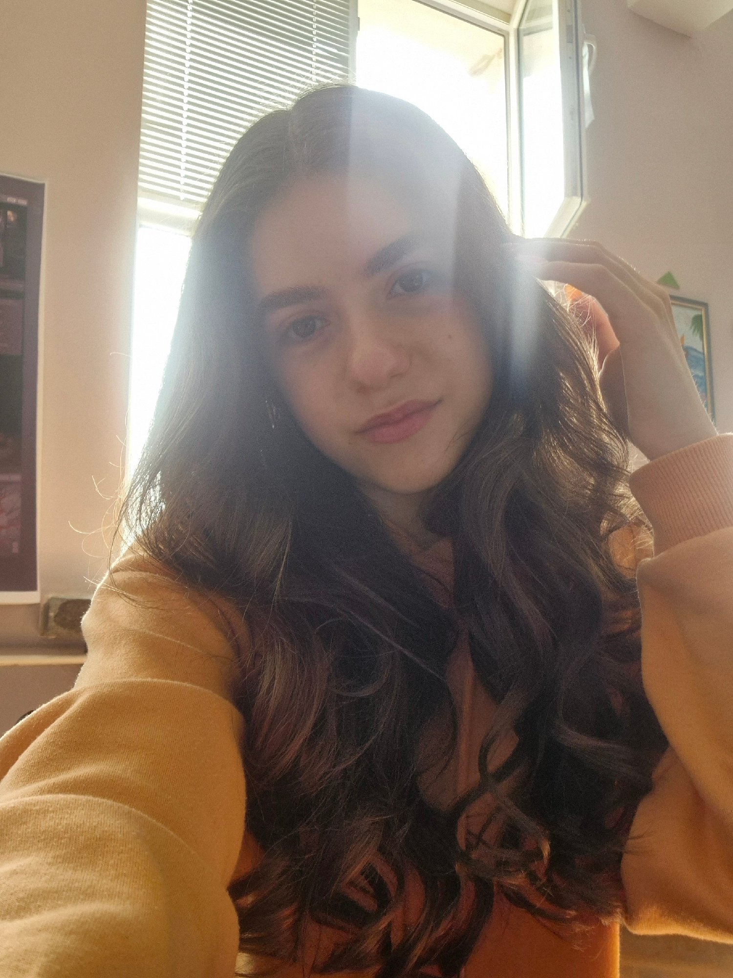A young woman with long, wavy, dark brown hair is wearing a yellow sweatshirt. She is looking directly at the camera with a slight smile. The image is taken from a low angle, so the background include…read more