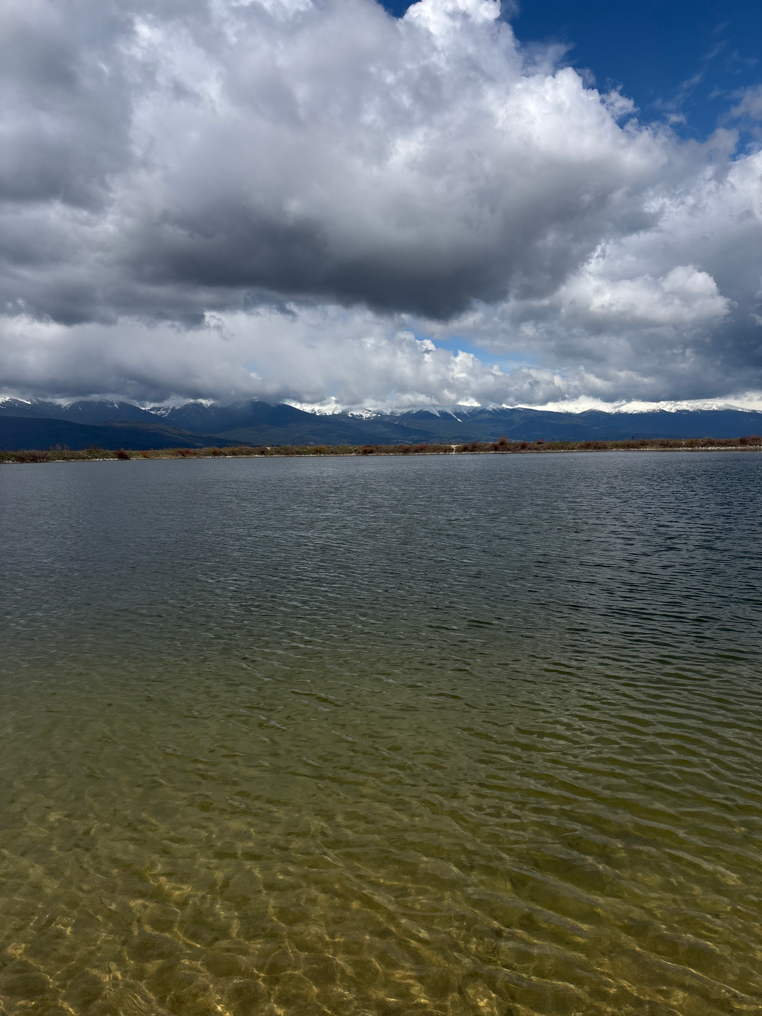 The image shows a body of water, possibly a lake, with mountains in the background under a cloudy sky. Some of the mountains have snow on them. The water appears to be shallow near the edge closest to…read more