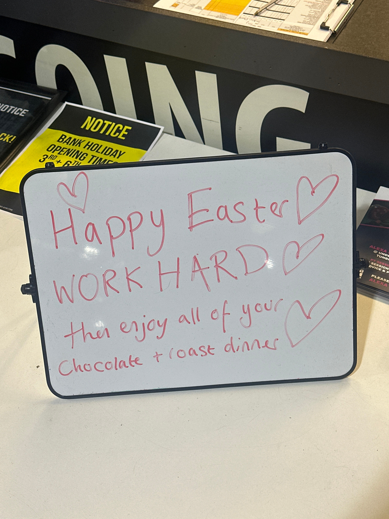 The image shows a white board with a handwritten message in pink marker: "Happy Easter [heart symbol] WORK HARD [heart symbol] Then enjoy all of your Chocolate + Coast dinner [heart symbol]". The boar…read more