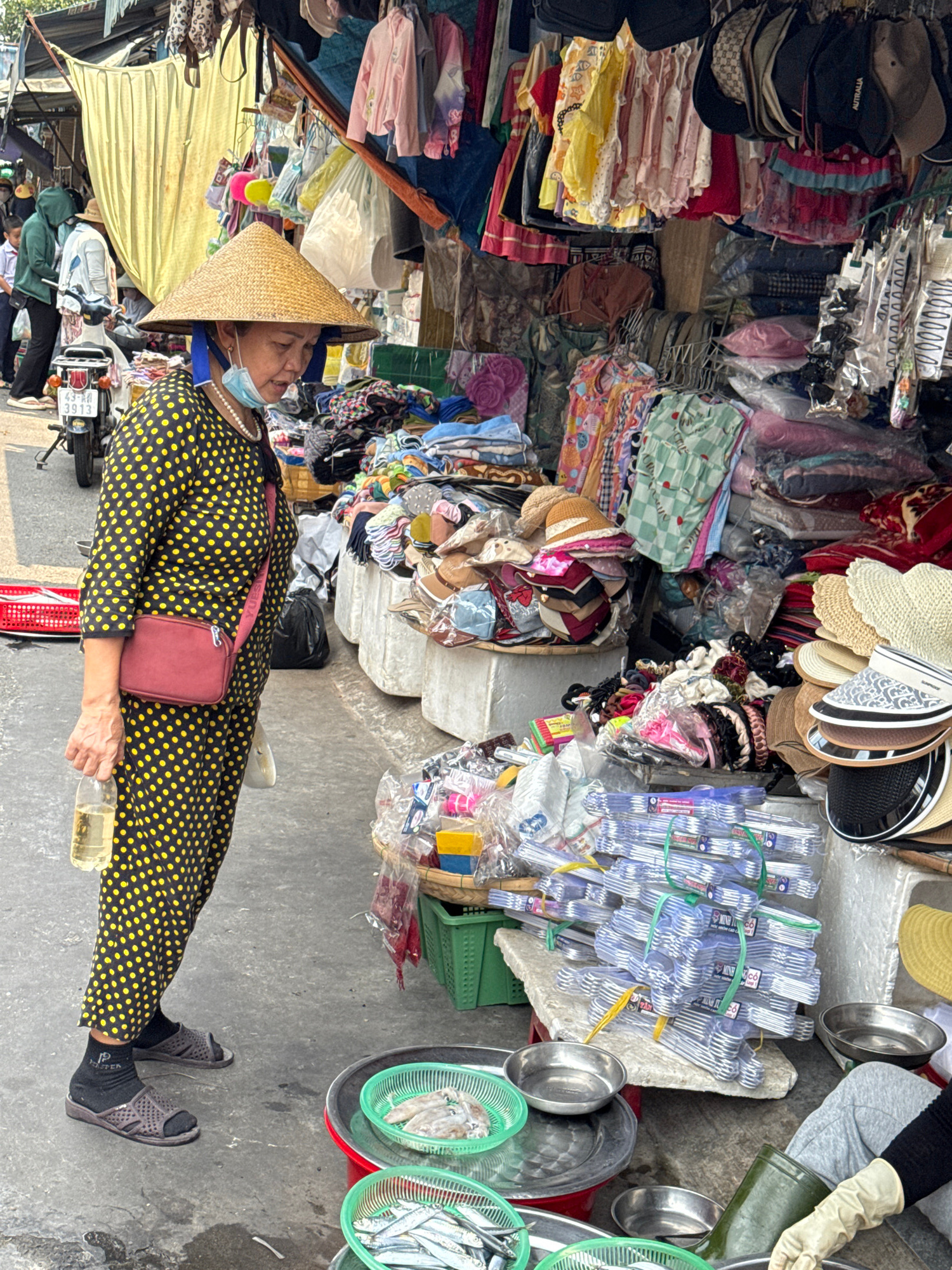 A high-angle, full-frame outdoor shot depicts an Asian woman wearing a conical straw hat, a black and yellow polka dot dress, a strand of pearls, black socks, and open sandals. She also has a red cros…read more