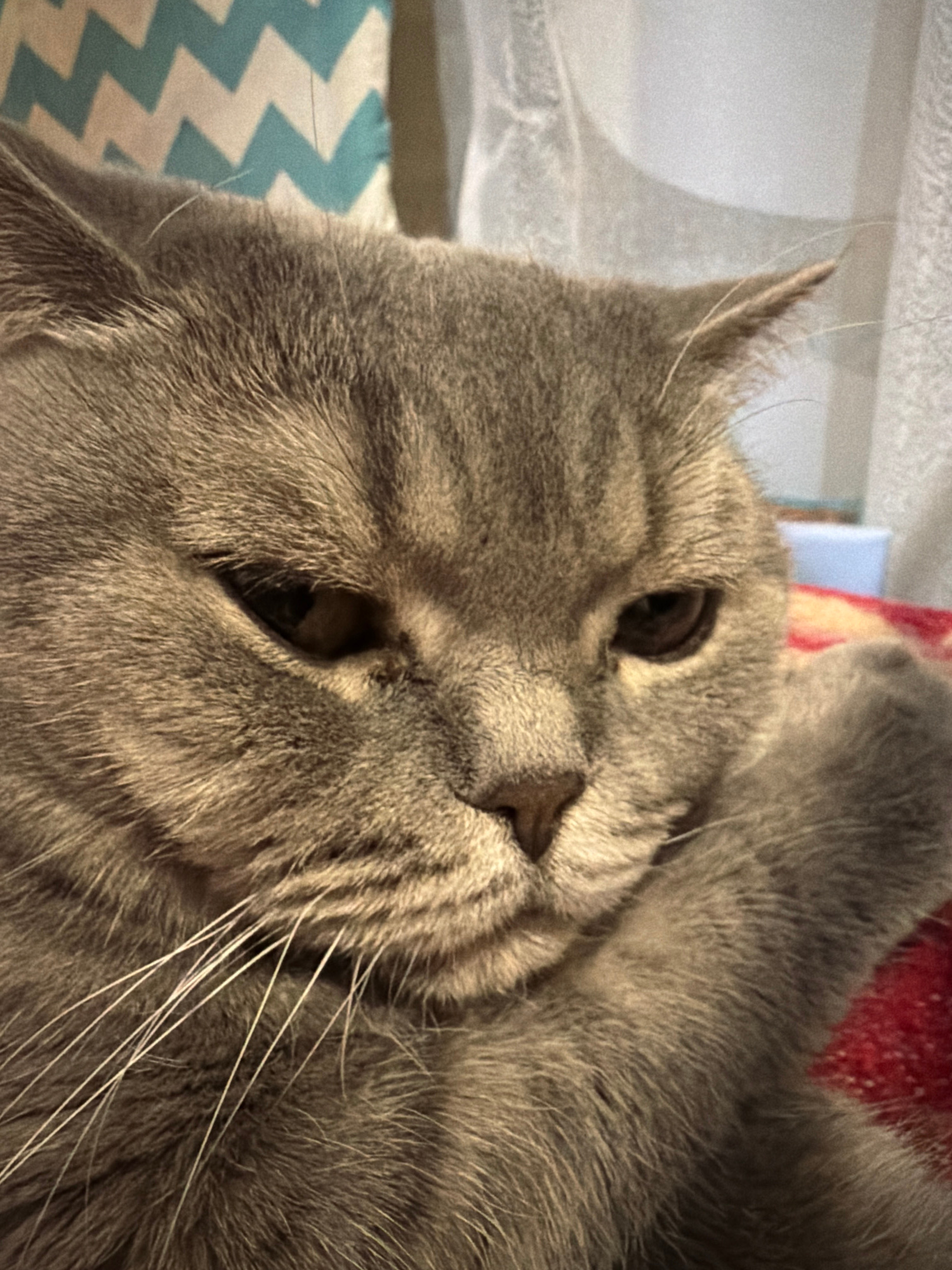 A close-up, indoor shot shows a grey cat lying down. The cat is positioned with its head tilted, featuring its face and part of its body. The fur of the cat is dense and appears well-maintained. The c…read more
