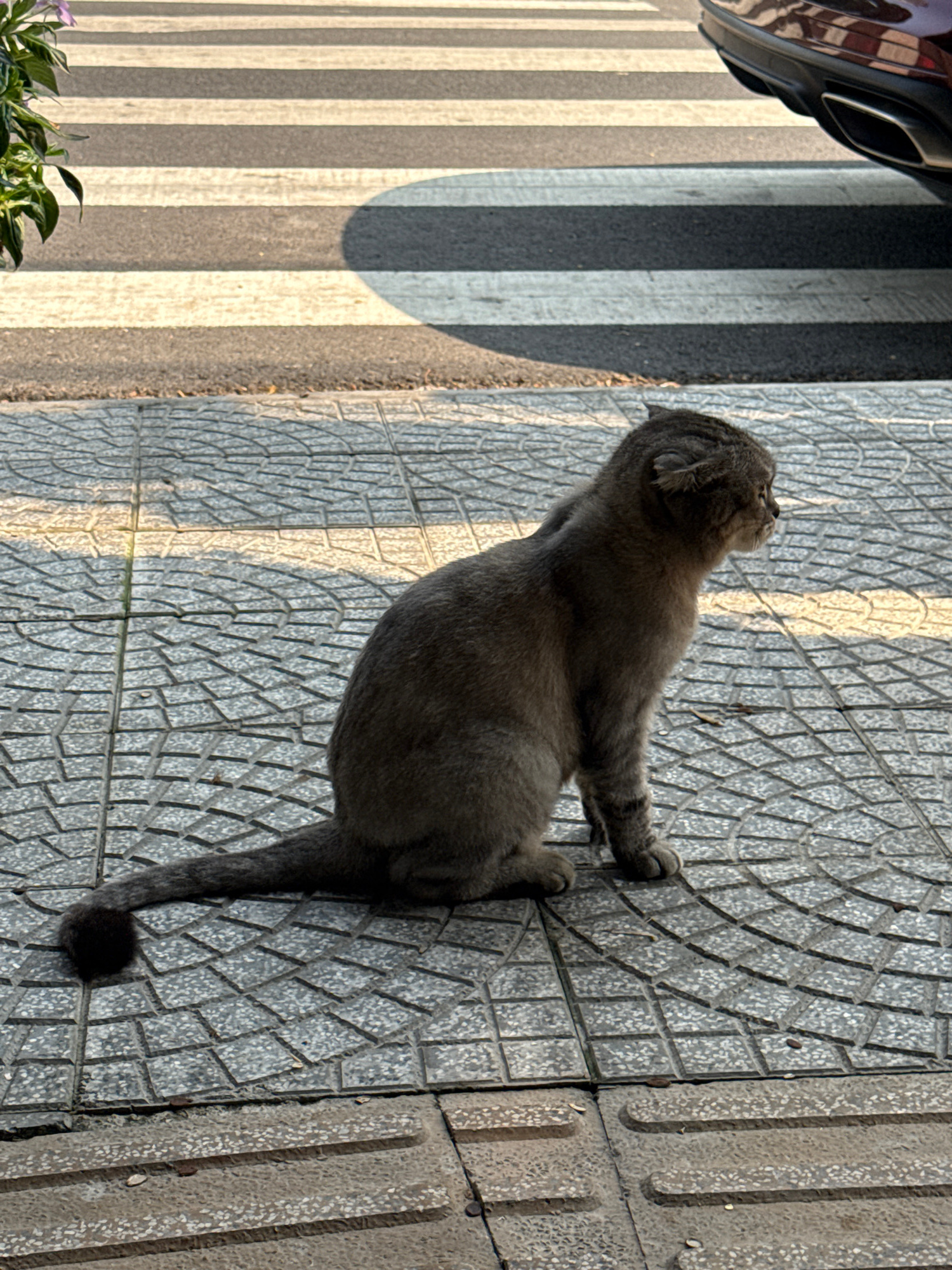 A grey Scottish Fold cat is lying on a patterned sidewalk next to a tactile paving edge. A crosswalk with a car partially visible is to the left. The scene is likely in an urban area of Đà Nẵng, Vietn…read more
