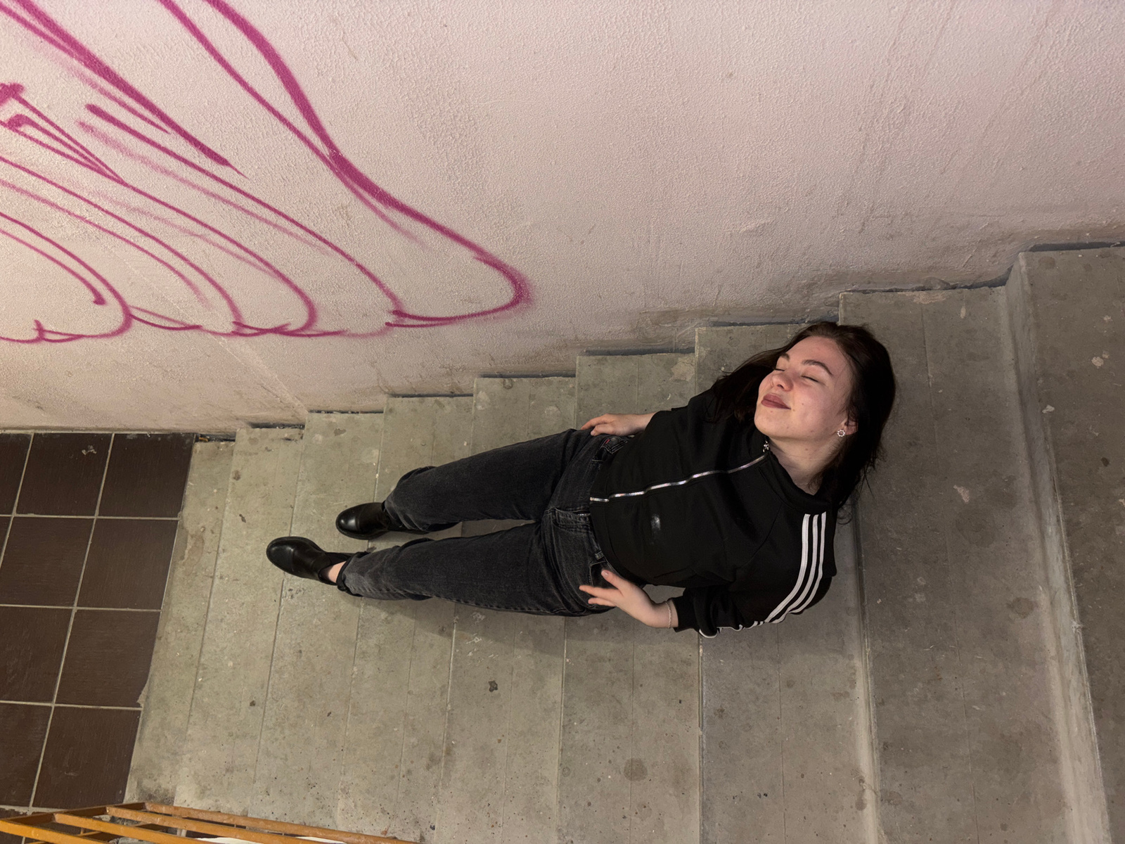 A young woman lies on a concrete staircase in what appears to be a stairwell. She is wearing black jeans, black boots, and a black Adidas jacket with white stripes on the sleeves. She is lying with he…read more
