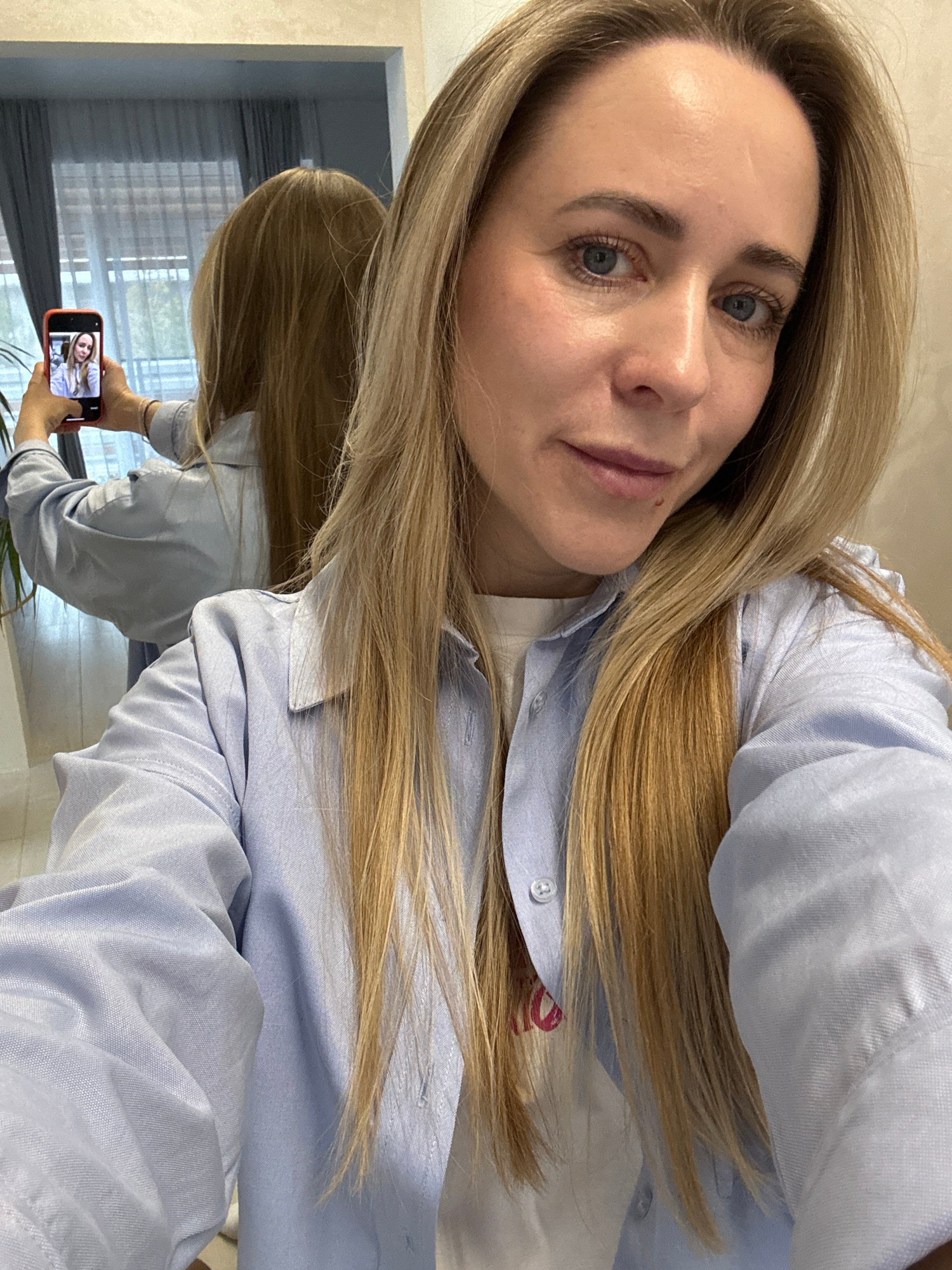 A woman with blonde hair and blue eyes is taking a selfie with her phone in a mirror. She is wearing a light blue button-down shirt over a white top. The reflection in the mirror shows the woman holdi…read more